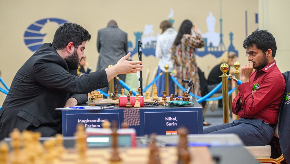 Day seven of the FIDE Grand Swiss 2025 brought a dramatic shake-up at the top, as Matthias Bluebaum and Nihal Sarin seized the lead in the Open with 5.5/7. In the Women’s Grand Swiss, Vaishali is again the sole leader after a victory over Guo Qi and is on 6/7. The round started with Señora Auxi Del Olmo – the mayor of the Spanish city of Linares – making the first move on board one in the Women’s tournament, in the game Stefanova – Lagno. Del Olmo was accompanied by Javier Ochoa de Echaguen, the President of the Spanish Chess Federation. Linares, a city synonymous with chess history, is set to be the stage for the FIDE World Women’s Team Championship 2025, which will run from 17 to 24 November. After leading for four straight rounds, Parham Maghsoodloo suffered his first loss in the tournament. He was defeated in the Slav by Nihal Sarin, who played as White. The Iranian maintained parity roughly until move 30, when time trouble caused him to slip. White is a pawn up and has two runners on the queenside, but it’s not easy. Black has pressure along the e-file, and the queen-pawn battery pins the g3-square, leaving White’s king exposed. The best choice for White here was to play 34.Rc7 which puts pressure on Black’s seventh rank but also cuts the queen pin on g3. But Sarin was also in time trouble and instead opted for 34.Nxg6? which was met by the immediate 34…Qg3+ and now the position is even. After 35.Kf1 Nf6 36.Rxf6! gxf6 37.Nxh4 the opponents reached the final critical position: Instead of taking on h4 and proceeding with Rc3, Maghsoodloo played 37…Rxb3?? which allowed White to evict the black queen with 38.Nf5! the rest was an easy ride for Nihal. After Qf4 39.Qxd5 Rb1+ 40.Kf2 Re5 41.Qd8+ Kh7 42.Qxf6 threatening checkmate on g7, Black resigned, catapulting Nihal Sarin to the shared lead in the tournament. Things also cleared up among the other four players who – like Sarin – entered the round with 4.5 points. Arjun Erigaisi lost as White to Germany’s Matthias Bluebaum. Playing against the Catalan, Erigaisi made several unforced errors, leading to a completely lost position as early as move 26. Black’s pieces are more active and he has potential discovered attacks along the d-file. Instead of moving his d2-bishop to safety with 26.Bf4 with a slightly inferior but defendable position, Erigaisi blundered with 26.Qxa7?? which was met by a quick 26…Ba8! The rook is attacking the queen, but the real target is the d2-bishop; wherever White puts his queen, she will be attacked in the next move by the d5-knight, opening the file for the rook to capture the bishop on d2. This victory launched Bluebaum to shared first place, together with Sarin. On board three, Anish Giri split a point with Abhimanyu Mishra in the King’s Indian. Despite Giri securing an extra pawn towards the end, it was a drawn rook endgame and Mishra held it without trouble. In other notable results of the round, Alireza Firouzja won as White against Uzbekistan’s Nodirbek Yakubboev. Uzbekistan’s pride was saved by another Nodirbek – Abdusattorov, who defeated Iranian Amin Tabatabaei in the Italian Game. Abdusattorov was better for most of the game, advancing his d-pawn before an effective finish: Out of many winning options Nodirbek chose the most spectacular: 36.Bd5! leaving Black paralysed, as he can either take the bishop or lose a knight on c4. Either way, the outcome was certain: 36…Bxd5 37.Rb8 and Black can’t prevent the queen promotion on c8. For his victory, Abdusattorov was declared the player of the day in the Open. In one of the most anticipated duels of the day, Hans Niemann defeated the 14-year-old Turkish prodigy Yagiz Kaan Erdogmus in a double-edged Petrov. The opponents traded mistakes in the critical position on move 13. Both sides are in attack mode. Instead of 14.Bxc6! Hans opted for the weaker 14.h3 giving a chance to Black to play sharp with 14…fxg2 and in case of 15.hxg4 then Qh4 16.Kxg2 Bd6 with a very uncomfortable position for White. But Erdogmus played 14…Bh5 allowing White to proceed with the original plan: 15.Bxc6 bxc6? 15…Qc6 was better. 16.Re5 Qg6 17.g3 Bd6 18.Nb3! Black can’t take on d5 because of 18…Bxd5?? 19.Nc5 with a threat of mate with Qa6-b7. Niemann converted this winning position with surgical precision forcing Black’s resignation on move 27. Rating favourite Praggnanandhaa and 2023 Grand Swiss winner Gujrathi both won their games today, maintaining close proximity to the top. But the World Champion, Gukesh D, continues to sink. He lost again today. A third consecutive loss for Gukesh Playing as Black against Turkey’s rising star, Ediz Gurel, the World Champion managed to gain a slight advantage in the middlegame but then blundered away. With a third loss in a row, Gukesh has completely sunk in the tournament. The Women’s tournament Vaishali R seized the top spot again, emerging as the sole leader in the tournament. Playing with the white pieces against China’s Guo Qi, Vaishali grabbed the initiative in the Petrov, opting for a sharp approach. Vaishali is attacking. Here Black had to decide where to retreat her queen. The best option was 21…Qg4 transferring her most powerful piece to the kingside and maintaining equality. Guo, however, moved her queen to a passive position with 21…Qa6? and after 22.Bxe7 (even better was 22.Nh5 immediately) 22…Nxe7 23.f4 h5? 24.f5! h4 25.Nh5 Rcc8 26.f6! White got to the black king. A few moves later Guo resigned facing the imminent checkmate. Another confident performance by Vaishali, who is on a path to defend her 2023 Grand Swiss title. The win puts her alone at the top and earns her player of the day honours. Vaishali’s co-leader from day six, Kateryna Lagno, drew with the black pieces on board one against former Women’s World Champion Antoaneta Stefanova. In the Four Knights game neither side secured any advantage throughout and a draw was agreed on move