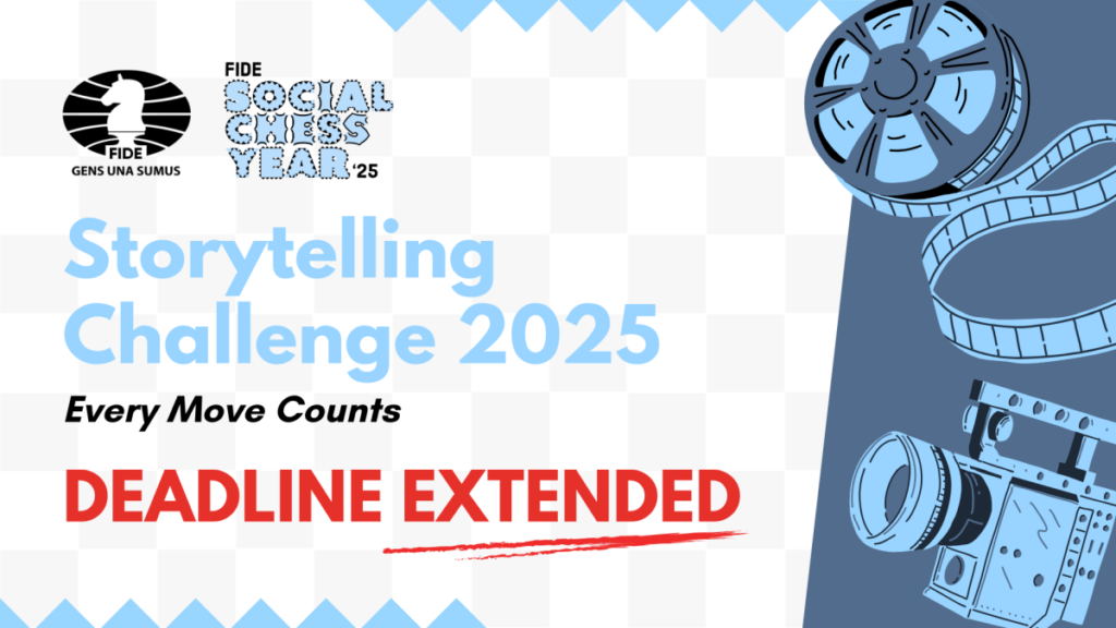 FIDE has extended the deadline for submissions to the FIDE Social Chess Storytelling Challenge 2025. Participants now have until November 30, 2025, to submit their stories under the theme “Every Move Counts.” The challenge invites filmmakers, educators, and chess promoters worldwide to showcase how chess is changing lives and strengthening communities. From classrooms and rehabilitation centers to local clubs and public spaces, these stories reveal how the game can inspire growth, connection, and inclusion. Participants can enter two categories; Professional or Grassroots (Amateur), and are encouraged to submit short films that highlight the social impact of chess in creative and authentic ways. Winners in each category will receive a FIDE trophy and an invitation to the Opening Ceremony of the 2026 Chess Olympiad, including accommodation for two nights for two guests. Selected stories will also be featured during the 2025 FIDE Social Chess Conference and promoted across FIDE’s official media channels. Participation is open to everyone, regardless of age or nationality. New submission deadline: November 30, 2025 Submit your film here: fide.com/social2025-storytelling-challenge/#send
