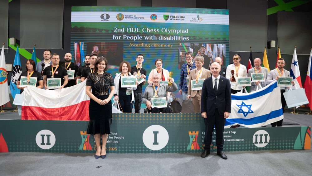 The 2nd Chess Olympiad for People with Disabilities concluded today in Astana, marking a historic celebration of inclusivity, determination, and unity – coinciding with the Republic Day of Kazakhstan. The final day began with a vibrant cultural performance featuring traditional Kazakh dances, music, and local cuisine, creating a festive atmosphere for the participants. The ceremonial first move was made by Andrey Gromov, President of the International Physically Disabled Chess Association (IPCA), together with Gulmira Dauletova, Executive Director of the Kazakhstan Chess Federation (KazChess). “It’s the first time Kazakhstan has organised such an event,” said Gulmira Dauletova. “After hosting the World Cadets Championship just weeks ago, preparing this Olympiad in only 20 days was a huge challenge – but our team worked tirelessly, and we are proud that everything went so well. The players are happy, and that means everything to us.” “Our main goal was to create smiles. Seeing the players enjoy themselves, especially during moments like our ‘Hug Day,’ was the most rewarding part,” she added. A short but powerful history The Chess Olympiad for People with Disabilities has a brief yet inspiring history. It began in 2020 with the first Online Olympiad, which saw 61 teams from 45 countries and nearly 400 players – Poland took gold in that inaugural edition. Three years later, the dream of meeting over the board became reality in Belgrade, Serbia, where 23 teams competed in the first in-person event – Poland once again emerged victorious. This year in Astana, the Olympiad reached a record 34 participating teams, making it the largest and most inclusive edition to date.The story continues: starting in 2026, the Olympiad for People with Disabilities will be held alongside the main Chess Olympiad, beginning in Samarkand, Uzbekistan. “For me, it’s special that chess allows people with all kinds of abilities to compete on an equal footing,” said Dana Reizniece, Deputy Chair of the FIDE Management Board. “Chess is one of the most inclusive sports in the world – and aligning these Olympiads ensures that everyone remains part of the same global chess family.” Thomas Luther, Chairman of the FIDE Commission for People with Disabilities, added: “From next year, the Olympiad for People with Disabilities will take place alongside the main Olympiad and the FIDE Congress – a major step that guarantees the continuity and growth of this event.” Stories of Inspiration Inclusivity in chess extends to every corner of the world. Blessing Jemani, captain of the Zimbabwean team, shared a powerful story about his young student Tinashe Mvududu, who plays chess using his legs.“He teaches us that disability is not inability,” said Jemani. “He’s an inspiration to our entire chess community – and though he couldn’t join us this year, we hope to see him competing next year in Uzbekistan.” Position of the Day The final round delivered thrilling chess moments — notably, the game between Ihar Rasikhin (FIDE 2) and Luisa Fernanda Molina Valdes (Colombia), featuring a brilliant “Greek gift” sacrifice: 26. Bxh7+ Kxh7 27. Qxf7 Qd8?? (after 27…Rxe1! 28. Rxe1 Qc4! White is only slightly better) 28. Qh5+ Kg8 29. g6, and Black resigned facing inevitable checkmate. Awarding Ceremony The closing ceremony was filled with emotion and pride. Dana Reizniece delivered a heartfelt speech, expressing gratitude to all contributors: “The 2nd Chess Olympiad for People with Disabilities has been a true festival of humanity – a magnificent demonstration of the unbreakable spirit of chess. On behalf of FIDE, I would like to express our deepest gratitude to the Government of Kazakhstan and President Kassym-Jomart Tokayev for their continuous support of chess and its development. Our thanks also go to the Akimat of Astana and Mayor Zhenis Kasymbek for their warm hospitality, and to the Kazakhstan Chess Federation and its President Timur Turlov for their exceptional organisation. We are deeply grateful to our partners, Freedom Holding Corporation and all sponsors, for their invaluable support, and to the National Paralympic Centre for providing world-class playing conditions. Finally, heartfelt thanks to the arbiters, fair play team, and volunteers whose dedication ensured everything ran flawlessly.” Team standings The final standings crowned the champions of the 2nd Chess Olympiad for People with Disabilities: 1st Place – FIDE 1 (Babarykin, Ermakov, Lipilin, Zakharova, Obodchuk)2nd Place –Poland (Tazbir, Molenda, Piekielny, Leszner, Wolanski)3rd Place – Israel (Gruenfeld, Streltsov, Gurbanov, Aleksandrova) Full results: chess-results.com Special awards and board winners Special prizes Youngest player with hearing disability: Farkas Virag (Hungary) Youngest player with physical disability: Atassi Celine (USA) Youngest player with visual disability: Kuanyshuly Nurgisa (Kazakhstan 2) Oldest player with hearing disability: Jimenez Moron Elias (Panama) Oldest player with physical disability: Babula Milan (Czech Republic; pictured below) Oldest player with visual disability: Bibikov Yuriy (Kazakhstan 3) Longest chess career (female): Dietsche Birgit (Germany) Best game: Cheyzer Crystal Mendoza (Philippines) Best performance: Maksim Ermakov (FIDE 1) Board winners Outstanding performances were also recognised on each board, highlighting individual excellence throughout the event: Board 1: 1. Amato, Leonel (Argentina) 2. Varadi, Viktor (Hungary) 3. Gruenfeld, Yehuda (Israel) – pictured belowBoard 2: 1. Glazar, Domagoj (Croatia) 2. Pavicevic, Jovan (Serbia) 3. Ermakov, Maksim (FIDE 1)Board 3: 1. Musokeri, Prince (Zimbabwe) 2. Rasikhin, Igor (FIDE 2) 3. Kishan, Gangolli (India)Board 4: 1. Cherono, Mercy (Kenya) 2. Ali Mohamed, Mohamed (Egypt) 3. Salamon, Julia (IBCA)Board 5: 1. Kambarova, Aiganym (Kazakhstan 2) 2. Sarkar, Md Ali Nawaz (Bangladesh) 3. Pavicevic, Jovana (Serbia) Passi