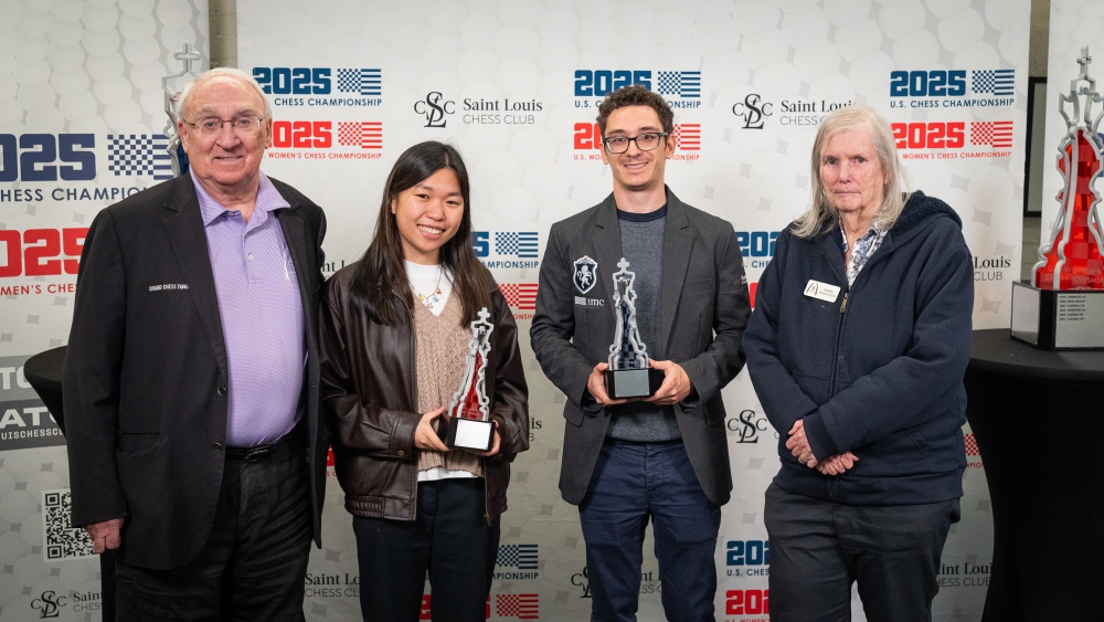 GM Fabiano Caruana and IM Carissa Yip were crowned U.S. Champions, winning their fourth and third consecutive titles, respectively. The 2025 U.S. Championships (Open and Women’s) were 12-player round-robins with a classical time control and a combined prize fund of $402,000. Held at the upgraded facilities of the Saint Louis Chess Club in St. Louis, Missouri, the tournaments attracted the strongest American players, with the exception of Hikaru Nakamura. The Open competition turned into a thrilling duel between Fabiano Caruana and Wesley So. Despite missing a win in their sixth-round clash, Caruana seized the lead in Round 9 and preserved it to the very end, securing his fifth national title with a score of 8/11. Wesley So finished a half-point behind the champion to take the silver medal. Levon Aronian completed the podium with 6.5/11; all three finished the event undefeated. The Women’s event followed an equally exciting script, with Anna Zatonskih, Carissa Yip, and Alice Lee sharing the lead with just two rounds to go. Yip finished strongly with two victories over Nazi Paikidze and Thalia Cervantes Landeiro to capture her fourth national title. Meanwhile, Anna Sargsyan pulled off two crucial wins over Zatonskih and Lee to claim the silver medal. Irina Krush scored 1.5 points in the final two rounds to secure the bronze. Photos: Saint Louis Chess Club / Lennart Ootes Official website: saintlouischessclub.org/event/2025-us-chess-championships/