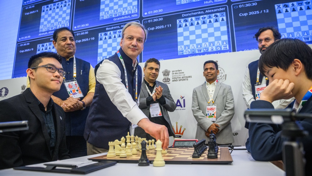 The first game of Round One of the FIDE World Cup began this afternoon at 3:00 PM local time in the Baga Resort Rio’s convention centre in Goa, India. The pristine venue hosted the opening clashes of what promises to be a thrilling month-long event, featuring 206 of the world’s top players battling for three coveted spots in the Candidates Tournament — the final step toward challenging for the World Championship title. The round opened with the traditional ceremonial first move: FIDE President Arkady Dvorkovich played 1.e4 on behalf of GM Jeffery Xiong (USA). AICF President Nitin Narang mirrored the move for GM Pranav V (India). According to tournament regulations, the top 50 seeds are automatically qualify for Round 2, meaning 78 games were contested today. Move of the day One of the first games to conclude in Round 1 featured the sensational Yagiz Kaan Erdogmus, currently rated 2651 and rapidly ascending the world rankings. Born in 2011, the Turkish prodigy is, as of 2025, the youngest grandmaster in the world — and today, he once again demonstrated why. Facing Candidate Master Nagi Abugenda (Libya, 1972), Erdogmus unleashed a brilliant attacking display in an Exchange French Defence. White, already behind in development and with his king stranded in the centre, was caught in the crossfire of a sharp tactical strike. From this moment, Black’s attack erupted with the bold sacrifice 10…Nce5!, forking the queen and bishop. The young grandmaster spent only six minutes calculating the sequence. “I thought this was going to be a long game and that I would win in the endgame,” said Erdogmus afterward. “But then he started to play very aggressively. I think he missed knight e5, and after that he’s just losing.” After 11.dxe5 Nxe5 (another fork), 12.Qxd5 Be6! followed — a developing move that renewed the attack by targeting the overloaded queen. When White retreated with 13.Qe4, Erdogmus continued energetically with 13…f5!, and after 14.Qe3, he had already foreseen the decisive 14…Bd5!, simultaneously attacking the rook on h1 and threatening 15…Nf3+ winning the queen. With no way to parry all the threats, Abugenda resigned a few moves later, conceding victory to the young Turkish star in impressive fashion. On board two, GM Jeffery Xiong (USA, 2648) prevailed in a difficult endgame against CM Li Yiheng (Hong Kong, 1994). Despite the 650-point rating gap, the 12-year-old from Hong Kong played far above his rating, testing the American grandmaster’s technique at every turn. https://www.youtube.com/watch?v=u79ZODb5XFQ In his post-game comments, Xiong praised his young opponent’s resilience and talent: “I wasn’t at all surprised because he is a very young player and, as someone who was already giving GMs a tough fight when I was thirteen years old, I knew going in that he was a prodigy and that I should take it very seriously.” On board three, GM Maxim Rodshtein (Israel, 2647) took the lead in his two-game mini-match against CM Qin Oscar Shu Xuan (New Zealand) with a crisp victory as Black. Rodshtein seized the initiative early, gradually building pressure before launching a decisive kingside attack that left his opponent defenceless. Meanwhile, on board five, England’s former world top-ten player GM Michael Adams (2646) showcased his renowned technical precision. In a queen endgame, Adams converted his outside passed pawn into a new queen, sealing a clinical victory in trademark style. Rounding out the top results, GM Vladislav Artemiev (FIDE, 2637) also outplayed CM Heskiel Ndahangwapo of Namibia, trapping his opponent’s queen in the middlegame — a rare tactical motif at this level, and one that drew murmurs of admiration from spectators following the games online. With so many fascinating games on display, it was impossible not to notice several dazzling moments of creativity. One game, in particular, stood out for its sheer precision and ingenuity. In his encounter with IM Satbek Akhmedinov (Kazakhstan, 2372), GM Pranesh M. (India, 2630) found the only move to force victory in a razor-sharp position. In the position, where 47.Bd4+ would have allowed 47…Qxd4, saving the game, and 47.Rf1 would have fallen to 47…Rxg2+!, Pranesh instead uncorked the spectacular 47.Qg7!! Now the twin threats of 48.Bd4+ and 48.Rc6+ loomed, either of which would have decided the game instantly. Akhmedinov tried to resist with 47…Ra1+, but Pranesh calmly blocked with 48.Rf1+!, picking up the rook on a1 and forcing immediate resignation. Outstanding stuff from the young Indian grandmaster. The World Cup’s opening round once again reminded everyone of its trademark unpredictability, as several underdogs punched above their weight to produce surprises and memorable results. The biggest upset of the day came when Chile’s top player, GM Cristóbal Henríquez Villagra (2605), fell with Black in a tricky rook + bishop vs bishop endgame against IM Agibileg Uurtsaikh (Mongolia, 2448). A handful of grandmasters were unable to break through and had to settle for draws — likely saving their energy and preparation for Game 2. Among them: FM Mohan Kavin (Malaysia, 2346), who held GM Robert Hovhannisyan (Armenia, 2633) to a solid draw. IM Reja Neer Manon (Bangladesh, 2369), who split the point with GM Aryan Tari (Norway, 2631). Another standout performance came from FM Daniel Barrish (South Africa, 2284), who pressed with Black throughout against Goa’s own GM Raunak Sadhwani (2641) before agreeing to a draw after 56 moves — a truly impressive result for the young South African. Last but not least, the only female player in the field, recent Women’s World Cup champion GM Divya Deshmukh (India), was defeated by GM Stamatis Kourkoulos-Arditis (Greece, 2583). Divya showed ambition from the start, sacrificing a pawn in the opening to build attacking chances. However, the compensation never fully materialized. As the game steered into a complex double-rook endgame, time pressu