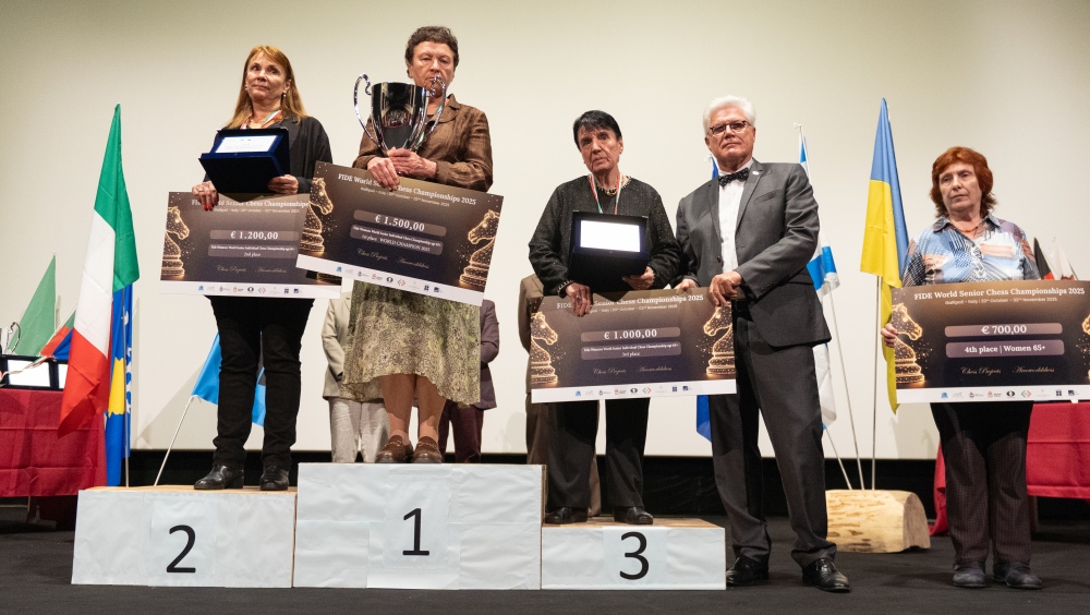 The record-breaking FIDE World Senior Individual Chess Championships 2025 concluded in Gallipoli, Puglia, Italy, after eleven intense rounds, with winners emerging in all four sections. GM Victor Mikhalevski (Israel) came out on top in the 50+ Open. Heading into the final round tied for the lead with GM Mikheil Kekelidze (Georgia) on 8.5/10, he scored a crucial victory over IM William Paschall (USA) to secure the title, while his rival could only manage a draw with GM Paul Motwani (SCO). Kekelidze took silver with 9/11, while GM Michele Godena edged out GM Murtas Kazhgaleyev for the bronze thanks to his victory in their direct encounter. Both the champion and the runner-up finished the event undefeated. Final standings 50+ Open The 65+ Open was the most tightly contested of the four tournaments. Four players—Alexander Reprintsev (UKR), Christian Maier (GER), Zurab Sturua (GEO), and Evgenij Kalegin (FIDE)—entered the final round sharing the lead on 8/10. When all four drew their games, IM Mark Ginsburg (USA) and GM Nikolay Legky (France) caught up by notching victories. The Buchholz tiebreak favored Alexander Reprintsev, who captured the gold medal, with Zurab Sturua and Christian Maier completing the podium. Final standings 65+ Open GM Ketevan Arakhamia-Grant (SCO) delivered a commanding performance in the 50+ Women’s section, scoring 8.5/11. The native of Georgia seized the lead in Round 5 and never looked back, clinching the title with a round to spare. Top seed GM Pia Cramling (SWE) and WGM Maritza Arribas Robaina (CUB) finished a full point behind the champion, tying for second place. The Swede took the silver medal as the winner of their direct encounter. Final standings 50+ Women WGM Galina Strutinskaia (FIDE) dominated the 65+ Women’s tournament. Scoring a remarkable 10.5/11, the fourth seed conceded just a single draw to her opponents and secured the title with a round to spare. Despite losing to the champion in Round 6, Marina Makropoulou finished strongly with two victories to claim silver with 7.5/11. Nona Gaprindashvili (GEO) and Larisa Khropova (FIDE) scored the same number of points, with the legendary Georgian champion rounding out the top three. Final standings 65+ Women The closing ceremony was held in Gallipoli’s historic Schipa Theatre, attended by Patrick van Hoolandt, Chair of the Appeals Committee; Yana Sidorchuk, FIDE Technical Delegate; organizers Cristina Pernici Rigo (Arcoworldchess) and Matteo Zoldan (Chess Projects); and several guests of honor. These included Pierluigi Piscopo, Counselor of the Italian Chess Federation; and Anio Iannuzzielo, Director of the Grand Hotel Costa Brada. The ceremony began with a minute of silence in memory of GM Daniel Naroditsky, who passed away at the end of October. It then continued with a performance by the multi-talented chess player and singer Nathan Resika, who delighted the audience with arias from Bizet, Verdi, and Mozart. The award ceremony followed, with the top finishers receiving trophies, medals, and symbolic checks. Official website: worldseniorchampionship2025.com/
