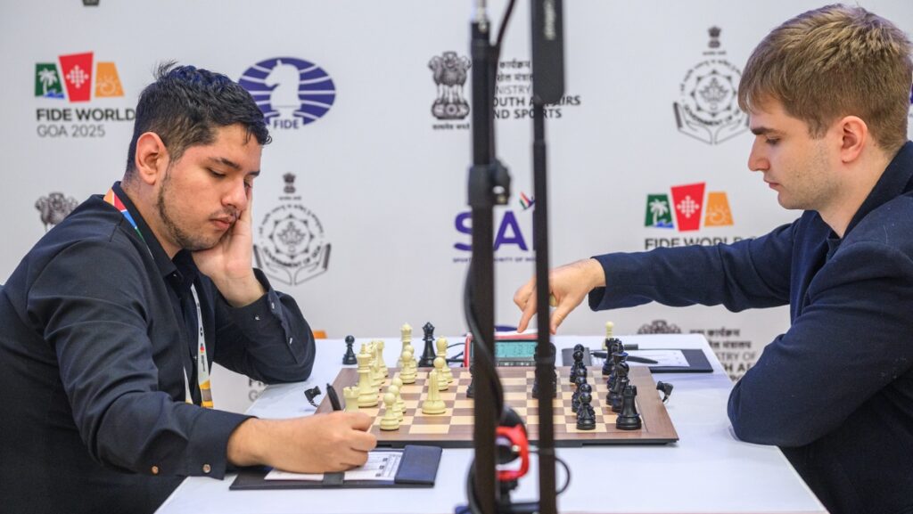 The tension in Goa was palpable as the Round of 32 of the FIDE World Cup resumed, with sixteen matches poised on a knife’s edge. The ceremonial first move, performed by Dr. Sagar Dilip Salgaocar, Managing Director of Geno Pharmaceuticals Pvt Ltd, set the stage for what would become a day filled with fierce strategic battles, high precision, and immense psychological pressure. Each player knew that a single mistake could mean the end of their World Cup journey. As the clocks started ticking, the players quickly settled into the rhythm of combat. The atmosphere inside the playing hall was a mix of quiet concentration and restrained intensity, the hum of moves being recorded, the soft clatter of captured pieces, and the quiet footsteps of arbiters echoing through the hall. Over the next six hours, fans witnessed a fascinating blend of caution and courage. While some grandmasters opted for pragmatic draws to secure qualification, others risked it all in pursuit of victory. From José Martínez Alcántara’s confident progression to the next stage to Levon Aronian’s creative handling of complications and Le Quang Liem’s composed elimination of Karthik Venkataraman, the day offered no shortage of drama. Yet, as so often happens at this stage of the event, many matches remained deadlocked, setting up a thrilling tiebreak showdown to decide who advances to the coveted final sixteen. Let’s take a deeper look into this afternoon’s action at the Rio Resort on Goa. Roughly an hour and a half into play, GM José Eduardo Martínez Alcántara (2644) became the first player to qualify for the final sixteen after forcing a draw against GM Alexey Sarana (2661). Having secured victory with Black in the previous game, the Mexican grandmaster only needed a draw with White to advance. Following his successful choice from the previous round, Martínez opted for the 2.c3 Alapin Variation against the Sicilian. Sarana appeared unfamiliar with the subtleties of the line and soon slipped in his move order. Sensing the opportunity, Martínez seized the initiative with the striking piece sacrifice 13.Nxa7! Nxa7 14.Ne5!, creating a double attack on the queen and the f7-pawn. This well-known opening trap has appeared at least five times before in master play, with five wins for White. However, after 14…Qb5 15.Bxf7+ Kd8, Martínez wisely chose the practical route, repeating moves with 16.Bb3 Ke8 17.Bf7+. Sarana had no real alternative but to accept the draw, as declining it would have meant losing significant material — and with it, his spot in the event. After confirming his qualification, Martínez joined the broadcast studio to share his thoughts on the game. https://www.youtube.com/watch?v=-nW_znq0MSo Immediately afterwards, the first draw of the afternoon was confirmed – coincidentally, between the same players who had battled for over 110 moves in one of yesterday’s final games to finish. Playing with White, GM Gabriel Sargissian (2624) agreed to a draw with GM Awonder Liang (2710), meaning their match will be decided tomorrow afternoon in the tiebreaks. In a classical Catalan Opening, Sargissian achieved a slight edge out of the opening, but Liang gradually neutralized the position, and a threefold repetition was reached around move thirty. GMs Lorenzo Lodici (2560) and Samuel Sevian (2698) continued their consistent form in Goa with a 32-move draw by repetition in a standard Italian Opening. Playing flawlessly, both grandmasters achieved a 99% accuracy score in a topical line previously tested by Lodici’s teammate, GM Daniele Vocaturo. Following yesterday’s topsy-turvy encounter, GM Daniil Dubov (2684) chose a deeply theoretical line in the Vienna Variation of the Ragozin Defence against GM Praggnanandhaa R (2771), perhaps aiming to surprise his young opponent. However, Praggnanandhaa was fully prepared, defending with 99% accuracy and steering the game into an equal rook-and-pawn ending. A draw was agreed on move thirty, another addition to the long list of balanced results in this heavily analysed correspondence line. Dubov, World Rapid Champion in 2018, when he triumphed ahead of Carlsen, Mamedyarov, and Nakamura, often shines when the clock runs low, making their upcoming tiebreak one of the most anticipated of the day. The sequence of draws didn’t end there: with elimination on the line, few players were willing to take undue risks. Within the next forty-five minutes, five additional games were drawn, adding ten more names to tomorrow’s increasingly crowded tiebreak roster. It was a solid draw with a 98% accuracy score between GM Aleksey Grebnev (2611) and GM Maxime Vachier-Lagrave (2737). Playing the 3.Bb5 Moscow Variation against the Frenchman’s Sicilian Defence, Grebnev steered the game into a French-type pawn structure after a few early exchanges. In his post-game interview with WIM Charlize van Zyl, Vachier-Lagrave admitted that he wasn’t particularly familiar with his opponent: “I didn’t know much about Grebnev until about a month ago, when he played a qualifying match for the World Cup against my team colleague GM Marc’Andria Maurizzi. He’s very solid and very confident.” Grebnev managed to secure a small edge, exerting some control over the e5-square, but never enough to truly trouble the French number one. The game soon fizzled out into a draw by repetition around move thirty. https://www.youtube.com/watch?v=ZMZkBkrQJAA The game between GM Richard Rapport (2724) and GM Sam Shankland (2654) also ended peacefully, this time with an impressive 99% accuracy score from both players. The two followed a 2018 Neo-Grünfeld encounter between top grandmasters Sjugirov and Li Chao until move thirteen. Shankland played quickly and confidently, suggesting deep home preparation, while Rapport appeared to be navigating largely on his own. The engines offered no significant improvements for either side – a truly flawless game. It’s hard to call a favourite in tomorrow