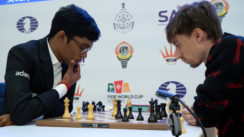 The fourth round of the FIDE World Cup in Goa ended with one of the most intense and dramatic tiebreak sessions of the event so far. Eleven matches returned to the playing hall this afternoon, with players battling it out across multiple time controls, from rapid to blitz and even Armageddon, to determine who would advance to the coveted round of sixteen. From the very start, it was clear that this would be a day of upsets and surprises. Several top seeds were eliminated, including multiple +2700-rated players, as underdogs seized their chances in rapid and blitz play. Experience, stamina, and nerves of steel became as crucial as opening preparation, as every mistake carried immediate consequences. By the end of the session, the field had been cut in half once again, revealing a captivating mix of established stars and fearless young talents. With just sixteen players remaining, the World Cup is entering its decisive phase, and the fight for the title, and for the coveted Candidates spots, is more open than ever. The round was opened by IA Dharmendra Kumar, President of the South Asian Chess Council and Chair of the 2025 FIDE World Cup Appeals Committee. He played 1.e4 for Peter Leko on board two. Quite surprisingly, no fewer than eight of the eleven tiebreak matches were decided in the very first section of the afternoon, consisting of two 15-minute games with a 10-second increment. The first player to qualify for the round of sixteen and the biggest surprise of the day was GM Aleksey Grebnev (2611), who eliminated one of the pre-tournament favourites, GM Maxime Vachier-Lagrave (2737). Known for his deep opening preparation and sharp tactical vision, Grebnev recently won the 2025 Dubai Open, a strong international event featuring several elite grandmasters, proving he is no stranger to facing world-class opposition. Although Vachier-Lagrave is a renowned specialist in blitz and rapid chess, Grebnev seized his chances brilliantly, winning the first game with White and then steering the second into a well-known theoretical draw to clinch the match. The key moment came in the first game: Despite being under pressure in a difficult endgame, the Frenchman still had drawing chances, but in time trouble he blundered with 47…Nd5+? (the correct move was 47…b5, with approximate equality). After 48.Kd4! b5 49.Bh6!, Black was suddenly lost due to the unstoppable threat of Bf8, which wins material. Soon after, another of the 2700+ favourites fell. GM Richard Rapport (2724) will have to wait another two years for another shot at the title, after losing both rapid tiebreak games to GM Sam Shankland (2654). A cornerstone of American chess for over a decade, known for his disciplined preparation and exceptional endgame technique, Shankland opted for the solid Caro–Kann Defence to neutralize Rapport’s creative initiative in the first game. The strategy paid off perfectly when the Hungarian number one faltered in the late middlegame. https://www.youtube.com/watch?v=lbp_Yg4vY0Y “I wasn’t very optimistic going into the tiebreak. In classical, it hasn’t gone too badly, but in rapid, he’s clobbered me before,” Shankland admitted in his post-game interview. This time, however, he turned the tables convincingly. In the second game, Rapport’s decision to employ the Pirc Modern Defence backfired spectacularly, as he soon found himself in a cramped, passive position, and Shankland efficiently converted the advantage, sealing the match with a 25-move miniature. GM Nils Grandelius (2645) will also be leaving Goa tomorrow, eliminated by GM Pentala Harikrishna (2697). The long-time Swedish number one, celebrated for his deep opening preparation and creative ideas, came up short in the first game, letting his opponent off the hook at a critical moment. With the psychological edge on his side, the player from Andhra Pradesh, renowned for his strategic depth and superb endgame technique, displayed his full class in the second encounter. Harikrishna crafted a strategic masterpiece, patiently outmanoeuvring his opponent to secure victory and advance to Round Five. By winning the first game and comfortably drawing the second, accepting a repetition in a completely winning position, GM Frederik Svane (2638) secured his spot in the round of sixteen, joining his compatriot Alexander Donchenko and confirming the impressive depth of the younger German generation. His opponent, GM Shant Sargsyan (2667) of Armenia, was unable to recover after losing the first game. The key moment came on move thirty White’s control of the d-file and pressure on the e5-pawn promised a lasting edge. However, after 30…Ne6! 31.Nxe5 Qg5! 32.Qxg5 Nxg5, Black would still have had reasonable drawing chances. Instead, short on time, Sargsyan spent two of his last three minutes to play 30…f6?, fatally weakening his kingside. Svane immediately seized the moment with 31.Nh4!, launching a decisive attack. Notably, Black could no longer contest the d-file with 31…Rad8, as 32.Nf5! wins material after 32…Qc7 33.Rxd8 Rxd8 34.Rxd8 Rxd8 35.Qa7, picking up at least a pawn. Despite determined resistance, the Armenian grandmaster could not save the game. GM Daniil Dubov (2684) produced one of the major upsets of the day, eliminating the 2023 Baku finalist and Indian hero GM Praggnanandhaa R (2771). Continuing the same pragmatic approach that has served him well in earlier tiebreaks, Dubov offered an early 12-move draw with the White pieces, effectively shifting the pressure onto his opponent to create winning chances in the second game. In his post-game interview with FIDE’s WIM Charlize van Zyl, Dubov explained his rationale: “Against players so good that I can’t really get an advantage in the opening, my strategy is to make a draw with White and get a game with Black.” And once again, his plan worked perfectly. In the diagrammed position, with both players down to their final minute, Praggnanandhaa erred with 35.Bxd5?, allowing 3