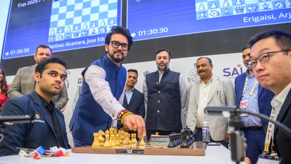 The tension was evident as players entered into the playing hall today, several arriving just minutes before the clocks were started, a sure sign of the pressure mounting at this decisive stage of the World Cup. The air in the playing hall was quiet and concentrated, yet packed with spectators eager to witness the eight remaining players in action. With only four spots in the semifinals, chess fans were treated to a blend of high-stakes precision and tightly controlled risk. The outcome was draws across all boards, meaning tiebreaks in three of them, and GM Nodirbek Yakkuboev advancing as the first semi-finalist after his victory over Alexander Donchenko yesterday. Before play began, the ceremonial first move was made by Mr. Anurag Singh Thakur, former Sports Minister of India, Member of Parliament, and Chairman of the Parliamentary Standing Committee on Coal and Mines on Board 2, for Erigaisi vs. Wei Yi. Quarterfinals Game 2 results: José Eduardo Martínez Alcántara ½-½ Javokhir Sindarov Arjun Erigaisi ½-½ Wei Yi Andrey Esipenko ½-½ Sam Shankland Alexander Donchenko ½-½ Nodirbek Yakubboev With the semifinal lineup still very much undecided, here’s a closer look at how each game unfolded today. Nodirbek Yakkuboev (2689) vs Alexander Donchenko (2641) Alexander Donchenko had a great deal at stake today. After fighting hard to survive the Round 5 tiebreaks, his classical loss yesterday left him in a must-win situation. He certainly tried, pushing until the very end, creating an imbalanced structure that forced Yakubboev to stay alert. The game followed the Exchange Variation of the Queen’s Gambit Declined, and Donchenko appeared well-prepared, gaining a 30-minute time advantage early on. However, despite his confident opening, his pace slowed and a series of imprecise choices led to a position where his winning chances faded. Black has just played the thematic 21…Bb1, aiming for a Ba2–c4 maneuver. While White has no obvious plan here, Donchenko chose one of the weakest options with 22.f3?, a move our commentators called “strange” as it gave Black easy counterplay. Yakkuboev responded with 22…f5 and followed through with his intended bishop maneuver, fully seizing the initiative. The critical moment came soon: White’s pieces were poorly coordinated, and the pawns on the third rank were vulnerable. Here, the powerful 26…Re8 could have posed major problems for White, especially with the threat of …Nb5 looming. If White tries passive defense with 27.Re1 Black builds up pressure with 27…Rb5 28.Rc2 Rb3. For instance, the natural-looking 29.Ng2 to guard the e-pawn is met by 29…Bd3 30.Rf2 (or 30.Rc3, also losing) 30…Bxb1 31.Rxb1 Nc4, leaving Black in full control. Instead, Yakkuboev started with 26…Rb5, allowing 27.Rg2. Though Donchenko escaped immediate danger, Black still held a comfortable edge. After further exchanges, the game entered a tense endgame where White appeared to retain some chances. However, Yakkuboev maintained accuracy and steered the game to a dead-even draw. With this result, he became the first player to qualify for the semifinals of the 2025 World Cup. Wei Yi (2752) vs Arjun Erigaisi (2773)As the only remaining Indian player in the field, Grandmaster Arjun Erigaisi carries significant expectations. Yet he has remained composed throughout the event, arriving calm at the board each day and greeting enthusiastic fans waiting (and chanting his name) outside. After a quick draw yesterday, today’s strategy was different – with the White pieces, Arjun prepared a fresh idea in the Queen’s Gambit Declined. Wei Yi, however, played confidently and quickly as well. The game soon left known theory and entered territory in which both players could just play chess. Tension started when Wei Yi chose to complicate with 18…c5, accepting an isolated queen’s pawn but gaining activity. The position suddenly became sharp: Arjun played the quiet-looking 20.Qe2 instead of the more natural 20.Qb1. Commentators GMs Jan Gustafsson and Peter Leko praised it as “strong and unexpected,” as it unpins the queen while provocatively placing it opposite Black’s rook and hinting at Na4 ideas. It posed psychological pressure. Wei Yi spent over 30 minutes here, visibly unsettled and shifting in his chair, before deciding on 20…Qc6. After 21.Nd2, however, Black 21…Nd7? (21…Nh5 was the better choice – we will get into that mess later, so bear with me if you want to get into deep analysis) allowing a tactical sequence: 22.Nb3 Bxc3 23.bxc3 Rxc3 Here Arjun had a golden opportunity – 24.Bxd5! and after 24…Qc8 25.Rxc3 Qxc3 White simply captures a free pawn with 26.Bxb7. Black also can choose 24…Qxd5 – and here is why the earlier mistake of 21…Nd7 matters. 25.Rxc3 Ng5 26.e4 (only move to keep the advantage and stop …Nf3), 26…Rxe4 27.Rd1! And the d7-knight is ill-placed and hanging. Instead, Erigaisi played 24.Qd2? and after 24…Rxc1 25.Rxc1 Qa6 26.Bxd5 Nf6! Wei Yi equalized and the game was drawn on move 32. Now let’s go back to the better 21…Nh5 which makes the difference. Now 22.Nb3 Bxc3 23.bxc3 Rxc3 24.Bxd5 does not hold the same venom after 24…Qxd5 25.Rxc3 Ng5 26.e4 Rxe4 and Black’s pieces, particularly the knights, are very active. The same idea we saw in the previous line of 27.Rd1 is a big blunder because of the desperado 27…Qxb3! And suddenly Black would be winning. This tactic would not be the same with the knight on d7. All of this analysis just goes to show how small nuances of a position can affect the evaluation but only surface moves later, and it’s curious to know whether all of this was seen. After intense days like these, we don’t corner the players for interviews, but after tomorrow I will definitely find out from the match’s victor how much was calculated here. Javokhir Sindarov (2721) vs José Eduardo Martínez Alcántara (2644)The draw between Sindarov and Martínez was the most curious result of the day, not