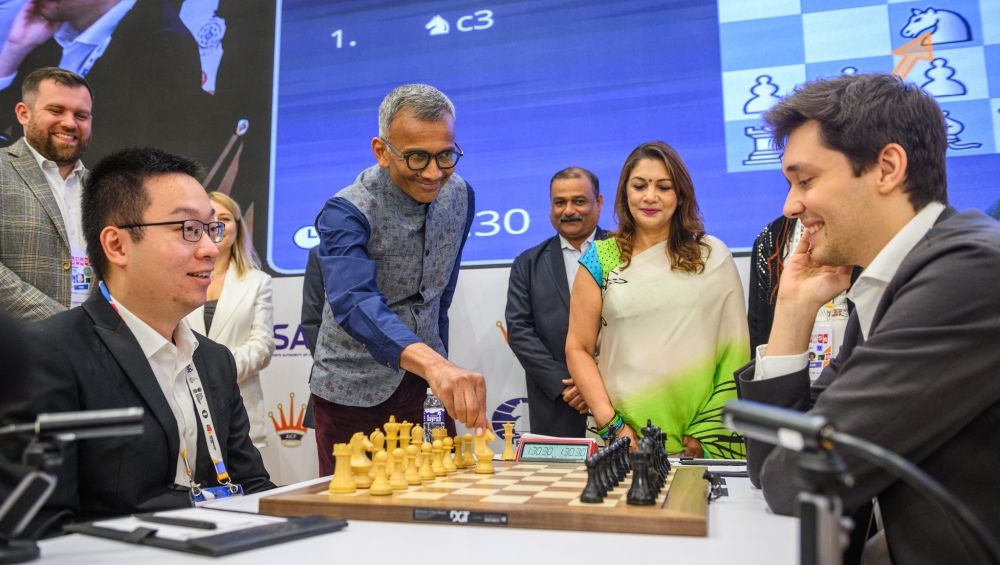 After a quiet rest day yesterday, the players returned to the hall where they have been competing for the last twenty days. A new stage setup elevated the boards, symbolic and fitting for the spectacle that the final rounds of the FIDE World Cup promise to bring. Today marked game one of the semifinals, and although both matches, Wei Yi vs Andrey Esipenko and Nodirbek Yakubboev vs Javokhir Sindarov, ended in draws, they were anything but uneventful. Deep preparation, opening surprises, time pressure and several only-move moments defined the day. Grandmaster Wei Yi, as has become routine, was the first to arrive, followed shortly by his opponent Grandmaster Andrey Esipenko. With a few minutes to spare before the round began, both sat quietly at the board, focused and still. Grandmaster Nodirbek Yakubboev arrived next, carrying his usual five bottles of water. Just before the clocks were started, the ceremonial first move took place, and moments later a slightly flustered and narrowly on-time Javokhir Sindarov entered the hall and took his seat opposite his Uzbek teammate. Today’s first move on the board between Wei Yi and Esipenko was made by Mr. Anup Shah, Managing Director of Resort Rio Goa, and Mrs. Alpa Shah, Director of Resort Rio Goa, two people who have led the wonderful hospitality provided to us throughout the last month. This month of remarkable chess has brought us to these intense final stages. As Grandmaster Fabiano Caruana, the first qualifier to the 2026 FIDE Candidates, stated online, the World Cup is an incredibly difficult tournament and regardless of how well one performs, only three participants leave truly happy: the three Candidates qualifiers. Watching the field shrink after every round has been bittersweet. With players departing every few days, the dining hall has grown quieter. And knowing that one of these four semifinalists, after fighting so hard to reach this point, will soon join the list of 202 eliminated players feels equally, if not more, bittersweet. Still, this is the nature of the event. Success here demands skill, stamina and a measure of luck. Semifinals Game 1 results: Wei Yi ½ – ½ Andrey Esipenko Nodirbek Yakubboev ½ – ½ Javokhir Sindarov Wei Yi (2752) vs Andrey Esipenko (2693) The first surprise of the day came immediately when Esipenko met Wei Yi’s 1.e4 with 1…e6. It was the same French Defense that the Chinese number one had successfully employed in his first quarterfinal game against Arjun Erigaisi. With a rest day available for preparation, unexpected choices made strategic sense, and Esipenko’s decision became even more logical when it became clear that he was not heading into a main line, but the Rubinstein Variation: 1.e4 e6 2.d4 d5 3.Nc3 dxe4 followed by 4.Nxe4 Nd7. It was reasonable to assume that Wei Yi may not have deep practical experience here. Although initially caught off guard after anticipating what he considered a guaranteed Italian, our commentators Grandmasters Peter Leko and Jan Gustafsson quickly agreed that this was a clever and well-timed choice by Black. Wei Yi appeared taken aback by the opening and took his time before committing to a structure and a plan. Esipenko essentially won the opening phase, reaching a slightly better position with two bishops and holding a significant time advantage. Wei Yi, on the other hand, found himself struggling to find chances for activity while also feeling the growing pressure of the clock. Then, suddenly, everything turned. A critical nuance required Black to play 27…Qf5 to remove White’s queen from the center before taking the pawn on h5. That line would have left White with an inferior but holdable position – requiring accuracy. Instead, Esipenko played the immediate 27…Qxh5, and after several minutes of calculation, Wei Yi unleashed the stunning 28.Bxa6! The bishop cannot be taken because the Black king would be exposed to decisive threats. The game continued 28…e5 29.Rd8 Rxd8 30.Rxd8 Ka7. Black attacked the bishop and threatened with 31…Bf5 but another incredible only-move followed instantly: 31.Qa4! which drew applause in the studio from Peter Leko. The game then concluded with 31…bxa6 32.Rd7+ Bxd7 33.Qxd7+ Kb6, after which the players agreed to a draw due to an unavoidable three-fold repetition. Being caught in deep preparation and finding yourself worse as White in a World Cup semifinal is never easy, but Wei Yi once again showed why he is one of the strongest performers of the event. He held his nerve, calculated with precision under extreme pressure, and found the correct moment to strike. Esipenko has previously said that luck is a necessary ingredient for success in the World Cup, and today it was his opponent who had that combination of accuracy and good fortune. Nodirbek Yakubboev (2689) vs Javokhir Sindarov (2721) Despite arriving slightly late, Sindarov seemed relaxed and confident. This was evident not only from his quick early moves and usual pacing around the hall, but also from the enthusiastic high-five he exchanged with his board neighbour Andrey Esipenko as they crossed paths in the opening minutes. Yakubboev, who arrived with the benefit of two consecutive rest days after avoiding quarterfinal tiebreaks, came armed with strong preparation against Sindarov’s Semi-Slav, the same opening they had played in their last two classical encounters. White opted for a sideline with 5.Qd3, but Black appeared completely prepared and unfazed, blitzing out correct theory as if he had predicted it. Soon, in fact, it was Yakkuboev who seemed surprised, spending 23 minutes on his 11th move despite Black having played only natural, expected moves. Despite this sharp start, nothing complicated emerged. Once both players were out of theory, the position settled, and they navigated it with great accuracy. After trading down to an even endgame, where only White could really push for something, Black offered a draw on move 30, which Yakubboev accepted. It