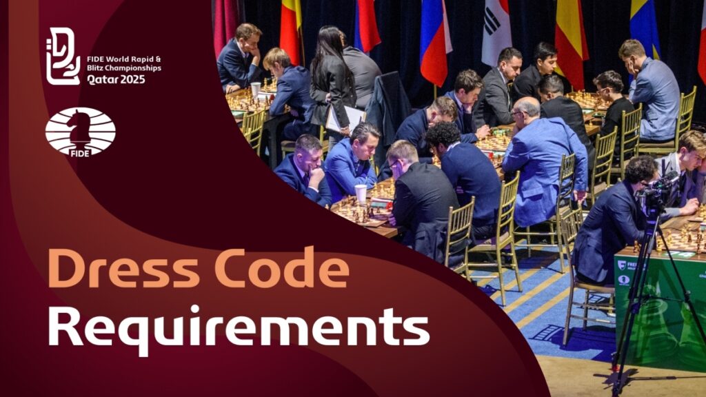 FIDE is pleased to publish the dress code for the FIDE World Rapid and Blitz Championships 2025 in Doha, Qatar: Dress code requirements The dress code is strictly observed for the tournament and all the official events and press-conferences. Clothing allowed for men: Suit Dark business casual trousers, including classic, non-distressed jeans (blue, black, and grey) Unicoloured shirt (with minor deviations allowed, e.g. checkered or striped) Dress shoes and loafers with closed toes Unicoloured sneakers (soles can be a different colour) Clothing allowed for women: Skirt suit, pantsuit, dress suit Dress Dark business casual trousers, including classic, non-distressed jeans (dark blue, black and grey) Shirt/blouse Dress shoes and loafers Unicoloured sneakers (soles can be a different colour) The clothes and shoes shall be neat and free of offensive slogans, tears, or rips. No players with t-shirts, shorts, baseball caps or inappropriate dress are allowed in the playing venue. Any requests to wear national or traditional dress shall be approved by GSC. Sanctions for dress code violations Minor Infringements Minor infringements are those committed without specific intent. Examples include a sloppy or unkempt appearance, wrinkled clothing, or other minor deviations from the standard. First Infringement will result in a financial penalty of 5% of the player’s total prize money earned in the two events, but not less than €300 for open events and €150 for women’s events. The player is allowed to complete the current day and is not obliged to change immediately. Further InfringementsSubsequent infringements will result in exclusion from the pairings for the next round. Major Infringements Major infringements are those demonstrating disregard for or denial of the dress code rules as a whole, or showing disrespect toward FIDE, the opponent, or their countries and national symbols. Examples include, but are not limited to, wearing shorts, beachwear, sleeveless shirts (for men), or clothing/footwear with offensive content or logos of prohibited sponsors (e.g., betting companies, alcohol, tobacco). Each infringement will result in a financial penalty of 10% of the player’s total prize money earned in the two events, but not less than €1,000 for open events and €500 for women’s events.The player will also be excluded from the pairings for the next round. Official website: worldrapidandblitz2025.fide.com/