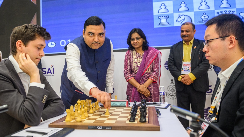 The second classical games of the semifinals followed a familiar script in Goa. Once again, deep preparation shaped both encounters, long early thinks filled the hall, and the positions that emerged were rich but balanced. And once again, neither game produced a winner. With two more draws on the board, all semifinal spots will now be decided in tomorrow’s tiebreaks. The ceremonial first moves were made by Mr. Sanjay Dhivre, IRS (Indian Revenue Service), Additional Commissioner of Income Tax, and Mrs. Bhagyahree Dhivare, IAS (Indian Administrative Service), CEO of the Election Commission Nagaland on board two. The first result arrived from the all-Uzbek clash between Javokhir Sindarov and Nodirbek Yakubboev. Their game featured subtle opening nuances before resolving into a level endgame on move 31. For two players who know each other exceptionally well and entered a line offering limited winning chances, the early handshake felt natural. The second game, between Andrey Esipenko and Wei Yi, carried more tension. The Chinese grandmaster had been outprepared and slightly outplayed in their first game. When I ran into him at dinner last night, I asked him about it, and he admitted he was “lucky” to escape with a draw. So it was concerning to see a similar storyline developing today when Esipenko, now with the white pieces, produced specific preparation and reached a slightly better position. He even had a moment where he could have pressed for more, but the chance passed. Wei stayed solid under pressure and steered the game to safety. With nearly a full month of play behind them, hours of preparation each day, and the physical and mental strain of the World Cup at its peak, fatigue is becoming a real presence for the final four. Today might have reflected exactly that. Here is how the games unfolded. Semifinals Game 2 results: Andrey Esipenko ½-½ Wei Yi Javokhir Sindarov ½-½ Nodirbek Yakubboev Andrey Esipenko (2693) vs Wei Yi (2752) Today’s game began with the Nimzowitsch Attack in the Petrov. Esipenko showed clear preparation in older theoretical paths, choosing 7.Bf4 (a line popular in the early 2000s) instead of the more modern 7.Be3. Wei Yi appeared surprised and paused for several minutes before replying. Despite having played this structure before, including a 2016 game against Wesley So, he clearly expected something different. This once again highlighted the strong preparation from Esipenko and his second, David Paravyan, who have been working effectively here in Goa (reportedly in between lobster dinners). Another notable moment arrived a few moves later when Esipenko played the rarer 10.Be2, spending around twelve minutes before committing. It raised the question of whether he had left his preparation or was digging deep to recall his lines, but in either case, it was another surprise. Later in the game, a critical moment arose, one that required calculation and understanding rather than automatic moves. In a position where White could press slightly, Esipenko chose a safer continuation instead of the line that offered the most practical chances. Here, the direct 20.f4 would have stopped Black from playing …g5 and left the h-pawn as a long-term target. It was not a winning attempt, but it was the kind of position where White makes Black solve problems under pressure. In a knockout setting, it would have been an attractive practical try. Instead, Esipenko chose 20.f3, allowing 20…g5. Both players developed naturally on the only open e-file. Wei tripled his heavy pieces lining up an “Alekhine’s gun” formation, but all rooks were eventually exchanged on the same file, easing Black’s defensive task. With the position equalised, the players began to repeat moves. Wei was low on time, and Esipenko played on briefly to push him to move forty, but no progress was possible. A second repetition confirmed the draw. Javokhir Sindarov (2721) vs Nodirbek Yakubboev (2689) The young Uzbek teammates agreed to a draw on move 31 in an objectively level endgame, but the opening phase contained several important subtleties. The game began with the Four Knights Spanish, the same opening Sindarov faced as Black in his second game against José Martínez in the quarterfinals, where the players followed a forcing drawing line. Today’s game started similarly but deviated early: 1.e4 e5 2.Nf3 Nc6 3.Nc3 Nf6 4.Bb5. Here, Yakubboev visibly hesitated, reaching for his knight before pausing and finally committing to the Rubinstein Variation with 4…Nd4. Perhaps he recalled Sindarov’s previous game and preferred to avoid that exact path, but he went ahead with the move nonetheless. This time, White deviated with 5.Nxd4 instead of 5.Bc4. The resulting structure is known for being solid for White but lacking major winning prospects, making it an interesting choice from Sindarov, who is usually more ambitious with the White pieces. A key moment soon appeared, demanding long calculation from both players. Here, Black’s main theoretical choice is 9…0-0, willingly giving up the pawn because after 10.Bxd7 Bxd7 11.Qxd7 Rae8, Black has threats such as …Qxf2 and ample compensation through piece activity and pressure. However, with elimination on the line, the semifinalists have generally been choosing safer continuations. This may explain Yakubboev’s decision to play 9…c6 instead, keeping the pawn. But this was not ideal, as it allowed White to build some initiative with 10.Qe2+ Qe7 11.Qh5!. The point is that capturing the bishop with 11…cxb5, is met by 12.Bg5 with a heavy pressure along the e-file – a type of dynamic position that suits Sindarov well. After thinking for nearly 30 minutes, Sindarov instead played the immediate 10.Qh5. This nuanced move-order shift gave Black slightly more room to reorganize. Yakubboev gradually solved his development issues, exchanged pieces, and steered the game into a balanced endgame that led to the eventual draw. One might label this 99%-accur