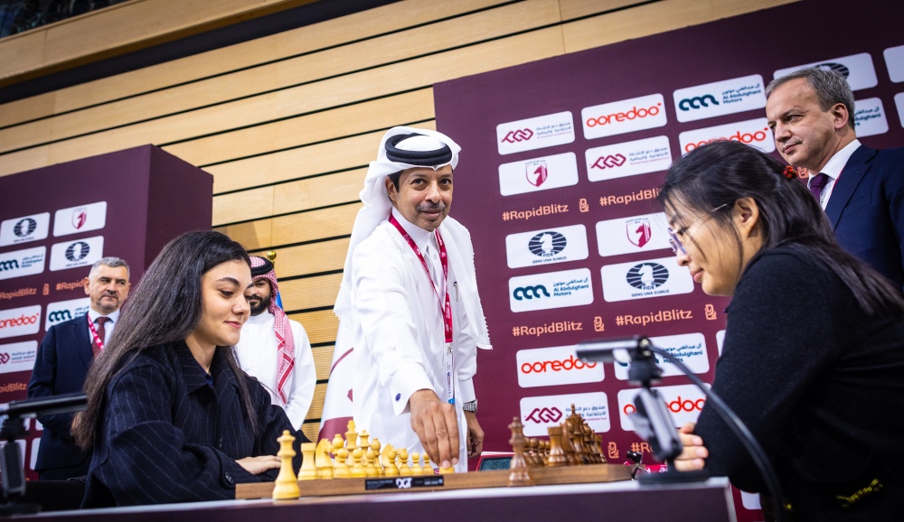 The 2025 FIDE World Rapid and Blitz Championships were officially opened in Doha, marking the start of one of the most watched chess events globally. As players and guests gathered in the playing arena at the Sports and Events Complex of Qatar University, the ceremony opened with a performance by the traditional Qatari music group Farkah. Dressed in national clothing and accompanied by drums, the ensemble performed “Today is the happiest day”, a song traditionally associated with the beginning of celebrations. The formal part of the ceremony began with the intonation of anthems of Qatar and FIDE, followed by an artistic performance symbolizing the battle of black and white pieces on the chessboard. The president of the Qatar Chess Federation Mohammed Al Mudahka – the country’s first Grandmaster – greeted the guests and wish them a warm and pleasant experience in the country which proudly calls itself “the global capital of sport.” FIDE President Arkady Dvorkovich reminded that Doha was a successful host of the World Rapid and Blitz Championships in 2016, noting that FIDE was proud to return “to a country which supports chess,” pointing to events such as the Qatar Masters. He added that “chess has a home in Qatar,” and linked the message to the country’s heritage with the line that Qatar is “the pearl of the chess world.” Dvorkovich thanked the hosts, the Qatari Chess Federation and its president Mohammed Al Mudahka, for welcoming the chess community “with warmth and open arms”. Turning to the players, Dvorkovich said the World Rapid and Blitz “traditionally marks an exciting end to the year,” and that this edition should be no different. “I wish the players the best of luck, fair play, good games and great experiences here in Doha,” he said. “May the best player win and may the spirit of chess flourish.” The ceremonial opening concluded with Dvorkovich and Al Mudahka making symbolic first moves on a chessboard, before moving to the top-boards in the Open and the Women’s section. The first event to take place is the World Rapid Championship, with 300 players from all over the world are taking part. The World Rapid consists of 13 rounds in the Open and 11 in the Women’s event, with five and four rounds taking place on day one, respectively. The action can be followed live on the FIDE YouTube Channel, featuring expert commentary by GMs Maurice Ashley, Peter Leko and IM Jovanka Houska. Written by Milan Dinic Photos: Anna Shtourman and Lennart Ootes Official website: worldrapidandblitz2025.fide.com/