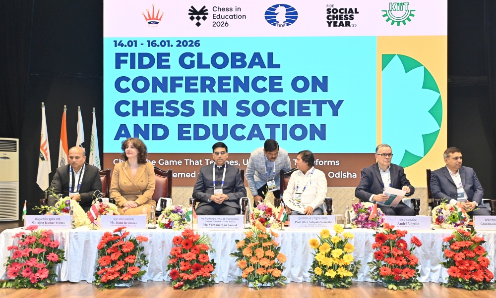 The FIDE Global Conference on Chess in Society and Education opened at KIIT University in Bhubaneswar on 14 January 2026, bringing together education leaders, researchers, social impact practitioners, and chess organisers for a three-day programme that also marks the launch of the FIDE Year of Chess in Education 2026. During the opening session, the moderator highlighted the role of Kalinga Institute of Industrial Technology (KIIT) as host of the conference and a long-standing centre for chess and education initiatives. KIIT has been organising international chess festivals for over 18 years, with the most recent edition featuring a total prize fund of INR 1.30 crore. The institution has produced 46 international chess players and hosted more than 30 international events, including World Junior Championships. Chess has also been integrated into KIIT’s broader educational framework, reflecting a sustained commitment to using the game as a tool for learning and development. The conference then formally opened with a ceremonial lamp-lighting, marking the inauguration of the event, followed by opening addresses from senior officials and partners, including Dana Reizniece, Deputy Chair of the FIDE Management Board, Viswanathan Anand, FIDE Deputy President, and Achyuta Samanta, Founder of KIIT, alongside André Vögtlin, Chair of the FIDE Social Chess Commission, Abhijit Kunte, Grandmaster, and Mukesh Ranjan Das, Executive Director (HR) of IndianOil. The opening ceremony and remarks set the tone for the conference’s two linked themes: chess as a social tool with measurable impact, and chess as a structured support for learning. “Education is about turning mirrors into windows,” said Dana Reizniece in her address to the audience, linking the idea to FIDE’s mission of using chess as a tool for empowerment and expanded ways of thinking. Anand emphasised that chess in education is “not to produce professional players,” but to help students “learn habits that improve performance in class,” pointing to focus, discipline, and decision-making as skills that transfer beyond the board. The conference then turned to the speakers and their presentations, with the day organised in thematic sections. FIDE Social Chess 2025 highlights and priorities for 2026 Vögtlin opened the conference programme with a review of the FIDE Social Chess Year 2025 and a forward look to 2026. He highlighted flagship campaigns across the year, including a month-by-month rhythm of themed initiatives, and the Social Chess Day tournament “Every Move Counts”, organised with Lichess.org, which drew 20,078 players worldwide. “Chess is more than a game. It is a tool to empower, include, educate, and transform communities worldwide,” said Vögtlin. “Following the success of the FIDE Social Chess Year 2025, 2026 will focus on scaling, professionalising, and globally embedding social chess as a measurable, evidence-based social impact framework.” The amplified connectome of the brain: Chess, the best scientific tool Dr. Cristóbal Blanco Acevedo followed with a neuroscience-focused presentation on how chess engages the brain across multiple systems rather than in a single “chess area”. “The most important question is not whether the brain will change, but into what it will change,” he said, pointing to the impact of environment and habits in a world of constant information overload. He explained that chess activates multiple areas of the brain simultaneously, particularly those linked to memory, calculation, and emotional control, while cautioning that not all forms of cognitive training translate effectively into real-life performance. How to build a big international social chess ecosystem for various social groups A core mid-morning session focused on how chess can be built into social ecosystems across different communities, with speakers from humanitarian, grassroots, and club-based backgrounds. Joining from Geneva, Francesca Bonelli, Head of Partnership and Coordination at UNHCR, outlined the scale of global displacement and the role sport can play in wellbeing and opportunity. UNHCR reports that 123.2 million people were forcibly displaced by the end of 2024. She also highlighted the FIDE and UNHCR collaboration that began in 2021 with a pilot “Chess for Protection” project in Kakuma, Kenya, and has since expanded to additional locations. Russell Makofsky, Founding Board Member of The Gift of Chess, spoke online about a practical, distribution-led approach to access, tracing the organisation’s origins to community initiatives during the Covid-19 pandemic and outlining its goal of distributing one million chess sets globally by 2030. “We saw how something as simple as a chess set could open doors,” Makofsky said. “When communities have access, opportunities begin to grow.” The session also included contributions from Rodrigo Barbeiton, who shared experiences from Club Magic Extremadura in Spain and the role clubs can play in long-term engagement. FIDE Social Chess programme updates After the networking break, the conference shifted into project-level updates from the FIDE Social Chess portfolio. Anastasia Sorokina (online) presented Chess for Protection, focusing on expanding safe, structured chess activities in refugee settings, particularly for girls and schools. Mikhail Korenman presented updates on Chess for Freedom, outlining developments in prison chess and upcoming continental and intercontinental competitions. Prabitha Urwyler presented Chess for Hope and Recovery, describing chess as a tool that provides structure, routine, and reflection in rehabilitation contexts. April Yunwei Zhong, via recorded video, highlighted how Chess for the Elderly supports both cognitive activity and social connection. Maryia Tamkovic presented Infinite Chess, focusing on adaptive learning models designed to meet players where they are. Social chess in India The afternoon returned to regional 