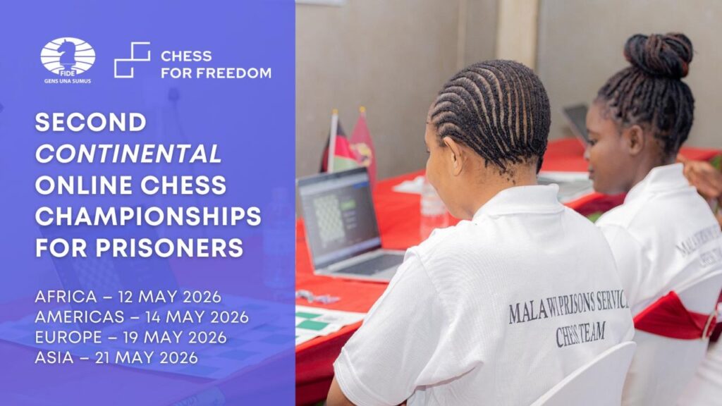 The FIDE Continental Online Chess Championships for Prisoners returns for its second edition, set to take place across four continents in May 2026. This event builds on the momentum of the inaugural continental championships in 2025 and is part of FIDE’s ongoing Chess for Freedom initiative – a programme designed to expand opportunities for intellectual engagement, personal development, and social reintegration through chess. The first Continental Online Chess Championships for Prisoners, held in May 2025, marked a major milestone in the Chess for Freedom programme, bringing together teams from correctional institutions around the world in structured online competition. That pioneering event demonstrated the power of chess to create connection and opportunity even in challenging circumstances, reinforcing the value of regular regional championships as a complement to FIDE’s established intercontinental events. The 2026 Continental Championships will again feature separate regional competitions for the following continents: Africa – May 12, 2026 Americas – May 14, 2026 Europe– May 19, 2026 Asia – May 21, 2026 Each continental championship will take place over a single day, with teams from correctional facilities within the region competing online on Chess.com. The format will vary based on the number of entries, using round robin or Swiss systems to ensure competitive balance and engagement. National federations and correctional institutions are invited to register teams representing: One men’s correctional facility team One women’s correctional facility team One juvenile team (players under 20) Countries that organise national prison chess championships may qualify additional teams, expanding access to regional competition. The championships feature rapid time control (10 minutes with a 5-second increment) and are structured to maintain fair play and security, with oversight and technical support coordinated by FIDE and its partners. As in the first edition, the focus remains on providing meaningful competitive opportunities while upholding the integrity of the event and the dignity of participants. Continental champions will be recognised with official titles and certificates, and all participants will receive acknowledgement for their achievements. FIDE encourages participating institutions to share reports and photos, where permitted by local regulations, to highlight the ongoing impact of chess behind bars. Registration is open until 1 May 2026, with no entry fee required. The 2nd Continental Online Chess Championships for Prisoners represent the continued evolution of the Chess for Freedom programme, reinforcing FIDE’s commitment to using chess as a constructive force for inclusion, empowerment, and personal growth around the globe. Registration & key dates Registration deadline: May 1, 2026 Registration: Click [HERE] to register Technical meeting: Week of May 5, 2026 (via Zoom) Correctional institutions must complete the online registration form and confirm their team’s participation via email to Mikhail Korenman at mikhail.korenman@ccsheriff.org.