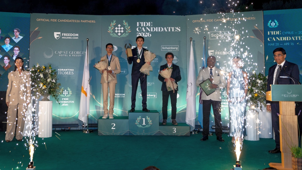 The closing ceremony of the 2026 FIDE Candidates and Women’s Candidates was a vibrant and memorable finale, an evening filled with emotion, celebration, and a distinctly Cypriot charm. Set against the stunning beachfront of the St. George’s Hotel & Resort, the one-and-a-half-hour show blended traditional dance, live music, bursts of fireworks, and moments of light-hearted humour. Hosts Maurice Ashley and Charlize Van Zyl opened the evening promptly at 8 p.m., welcoming an audience of more than 100 players, coaches, family members, friends, sponsors, and organizers. There was a palpable sense of pride and relief in the air after three intense weeks of competition, with smiles and laughter shared among the guests. Following the national anthem of Cyprus and the FIDE anthem, the audience was treated to a moving video recap of the tournament’s most memorable moments. The film drew warm applause and, maybe for some, a touch of nostalgia. The ceremony continued with a pre-recorded message from the President of Cyprus, Nikos Christodoulides, who praised the players’ dedication and highlighted the importance of hosting such a prestigious global event on the island. Viswanathan Anand, five-time World Champion and Deputy President of FIDE, then took the stage to warm applause. In a thoughtful and reflective speech, he spoke about the unmistakable generational shift taking place in the chess world: how a fearless new wave of players is rising, challenging, and standing shoulder to shoulder with the game’s long-established titans. The mood then shifted to celebration, as traditional Cypriot music and dance performed by a local troupe brought colour, rhythm, and energy to the evening. This lively interlude set the stage for a series of speeches from key figures, including Criton Tornaritis, President of the Cyprus Chess Federation; Valeriia Avksenteva, Deputy Executive Director of Freedom24; Marinos Lamprou, Mayor of Akamas, and Panayiotis Markou, Director of Sales and Marketing at the St. George’s Hotel & Resort. It was Markou’s speech, however, that sparked the most emotional response of the evening. As he announced that each room the players had stayed in would be named after them, the audience erupted into a warm and sustained applause.The ceremony continued with the introduction of the sixteen contenders of the 2026 FIDE Candidates and Women’s Candidates Tournaments, presented by Angelika Valkova. With charm and wit, she engaged some of the players in light-hearted questions, drawing genuine laughter and relaxed, candid responses. Finally, the prize-giving, the emotional climax of the evening, brought the ceremony to its most meaningful and memorable moment. In the FIDE Women’s Candidates, Zhu Jiner claimed the bronze medal, while Bibisara Assaubayeva took silver. They were joined on the top step of the podium by the winner, Vaishali Rameshbabu. As the three stood together, the audience rose in a heartfelt standing ovation, acknowledging not just their results but the intensity and brilliance of their performances, with the national anthem of India adding a powerful note to the celebration. The awards were presented by Valeriia Avksenteva, Deputy Executive Director of Freedom24, and Isai Scheinberg, a long-standing supporter of chess and the first recipient of the FIDE Medal of Merit in the 21st century. Attention then turned to the Open Candidates. Fabiano Caruana received the bronze medal, while Anish Giri secured silver. They were joined by the tournament’s winner, Javokhir Sindarov, whose achievement was met with enthusiastic applause, while listening to the anthem of Uzbekistan. Sindarov, visibly moved, delivered a short and sincere speech, expressing gratitude and reflecting on his journey. The awards were presented by Viswanathan Anand, Deputy President of FIDE, and Marina Stylianides, Director of Cap St. Georges and Korantina Homes. The evening concluded on a unique and touching note with a pre-recorded telephone conversation between the President of Uzbekistan and Sindarov. The full broadcast of the closing ceremony can be watched on the FIDE YouTube channel: https://www.youtube.com/watch?v=MX6t9yot0X8 Written by IM Michael Rahal, FIDE press Officer Photos: Michal Walusza, Niki Riga