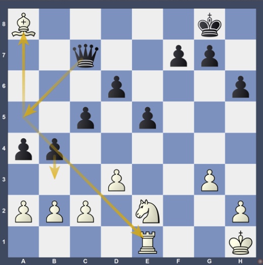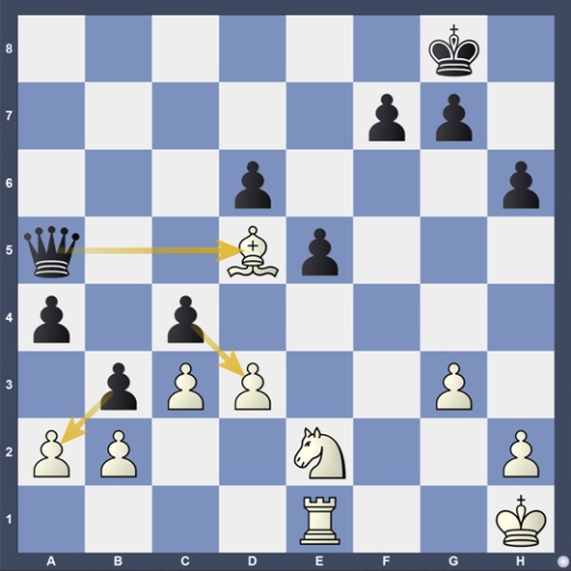 23… b3!! – a dynamic pawn thrust, threatening a double attack after …Qa5. White tried 24. Bd5 Qa5 25. c3, but then came another stunning move: 25… c4!, creating multiple threats.
