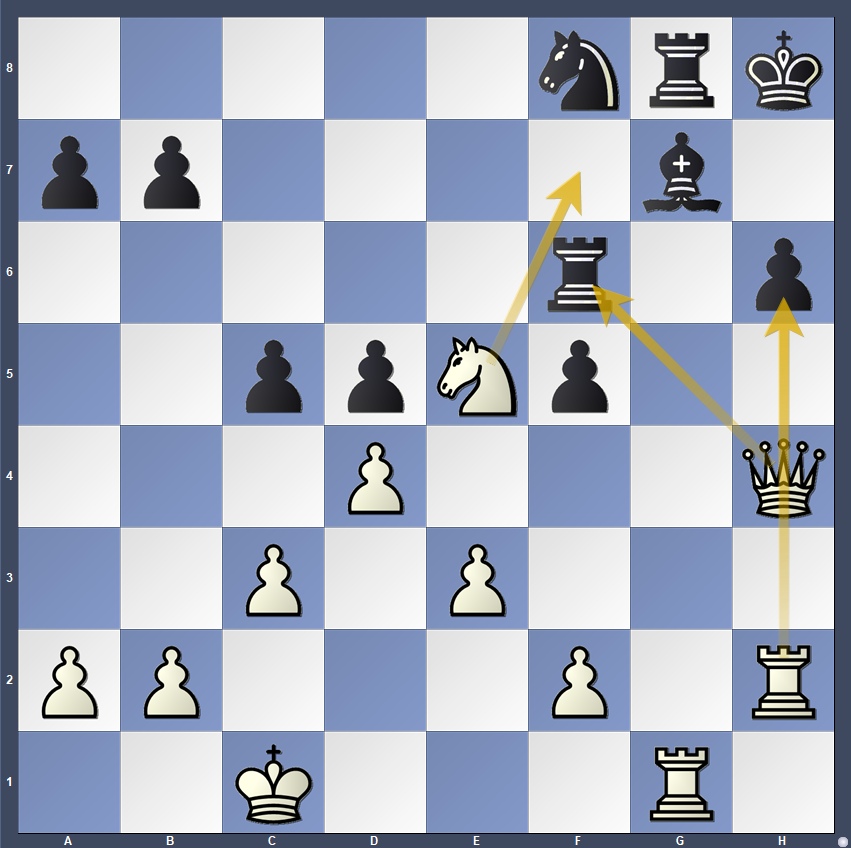 White sacrificed the queen with 27. Qxf6!!, delivering a beautiful checkmate after 27…Bxf6 28. Rxh6+ Nh7 29. Nf7#.