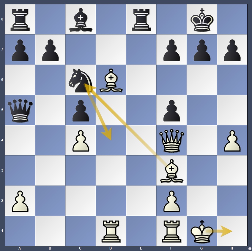In this position, Nakamura, already very low on time, chose 20.Kh1, and after 20…Nd4! the end was near. Instead, his best chance would have been 20.Bxc6 bxc6, followed by 21.Qg3, with ideas such as Be5, h5–h6, and Kh2/Rg1, keeping the fight alive.