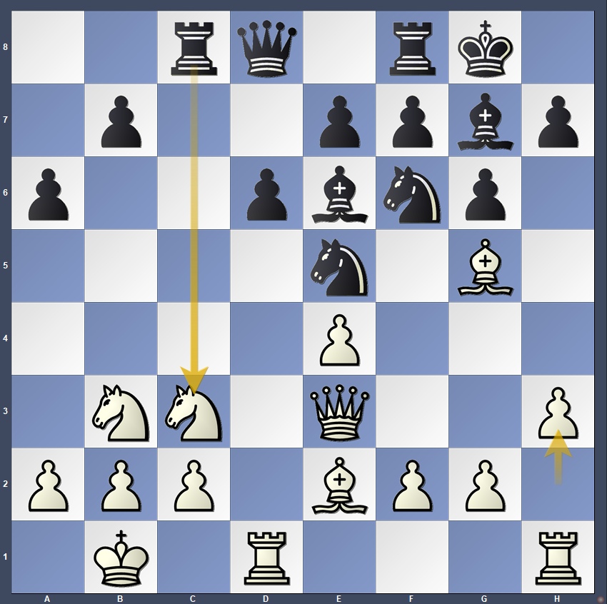 With the stunning 13…Rxc3!, Fabiano gave up the rook to shatter White’s queenside structure. After 14.bxc3, he methodically increased the pressure against his opponent’s weakened, queenside-castled king. If instead 14.Qxe3, then 14…Nxe4 would have given Black strong compensation for the exchange.