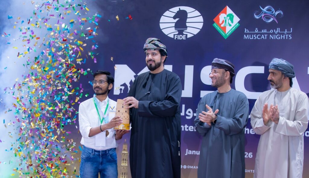 The Muscat Nights International Chess Championship 2026 concluded in Muscat, Oman. Running from January 14–24, 2026, the competition has grown into one of the most significant FIDE-rated international chess events in the Middle East. Organized by the Oman Chess Committee and hosted at the Al Amal Club Hall, the championship attracted a broad global field and delivered a strong competitive standard across two categories – Over 2000 (Open A) and Under 2000 (Open B). Both competitions were 9-round Swiss tournaments with classical time control. The event also featured a highly competitive blitz tournament. The 2026 edition continued the strong legacy of previous years, seeing expansion in both participation and international diversity. The championship featured 270 players representing 36 countries, including more than 10 GMs and over 10 IMs. The strong presence of titled players provided valuable competitive exposure for regional and emerging players. The competition in Oman was widely recognized for its organizational quality, competitive excitement, and its contribution to the local and international chess ecosystem. Final standings – Open A Final standings – Open B Final standings – Blitz Indian players delivered particularly strong results, sweeping top honors across two categories and once again proving the strength of their national chess development programs. As part of the accompanying programs of the Muscat Nights Chess Championship, the Oman Chess Committee organized a cultural sightseeing tour for the participating players, which included visits to several prominent tourist and cultural landmarks in Muscat Governorate, such as Mutrah Souq, Al Alam Palace Square, the National Museum, and the Royal Opera House Muscat. This initiative was aimed to introduce participants to the Sultanate of Oman’s rich cultural and historical heritage, while enhancing their overall experience beyond the competitive atmosphere of the tournament. In addition, the Committee organized friendly football matches for the players at the outdoor artificial pitch of the Sultan Qaboos Sports Complex in Bausher, following the conclusion of the daily competitive rounds. These recreational activities were designed to strengthen bonds of friendship, encourage interaction, and promote camaraderie among players from different countries.