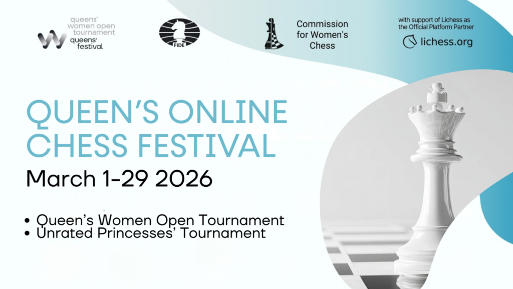 The Queens’ Online Chess Festival will return in March 2026, marking its 6th edition as a global celebration of women’s chess. Organised by the FIDE Commission for Women’s Chess under the Chess4All FIDE WOM Project, the festival will run from March 1-29, 2026 and is dedicated to International Women’s Day (March 8). Participation is free of charge, and the festival is open to women and girls of all ages and playing levels, including unrated players from around the world. The 2026 edition of the Queens’ Online Chess Festival will once again feature two parallel competitions, offering opportunities for both rated and unrated players: Queens’ Women’s Open Tournament Unrated Princesses’ Tournament Queens’ Women’s Open TournamentOpen to all female players with a FIDE ID, the Women’s Open is structured as a series of continental online blitz qualifiers, followed by a Semi-Final and a Final. The qualification tournaments will take place as follows: African Online Blitz Qualification – March 1 (9:00 UTC) European Online Blitz Qualification – March 7 (9:00 UTC) Asian Online Blitz Qualification – March 8 (9:00 UTC) American Online Blitz Qualification – March 15 (13:00 UTC) Each continental qualifier will be played as a 9-round Swiss tournament with a 3+2 blitz time control. The winner of each qualifier will receive the title of Queen of her respective continent. The top 25 players from each continent will advance to the Queens’ Online Semi-Final, scheduled for March 22 at 13:00 UTC, where 100 players will compete in a 9-round Swiss tournament. The top eight finishers from the Semi-Final will qualify for the Queens’ Online Final, a 7-round round-robin blitz tournament played on March 29 at 13:00 UTC, with a 5+5 time control, to determine the overall winner of the festival. Registration deadlines for the continental qualification tournaments are as follows: Africa: February 22, 2026 Europe & Asia: March 1, 2026 Americas: March 7, 2026 The registration form for the Queens’ Women’s Open is available [HERE]. Unrated Princesses’ TournamentDesigned for girls without a FIDE rating, the Unrated Princesses’ Tournament is open to players in the U9, U11, U13, U15, and U17 age categories (U17 players must be born on or after 1 January 2009). The Princesses’ competition will include: Online Qualification Group A – March 16 (9:00 UTC) Online Qualification Group B – March 16 (13:00 UTC) Online Final Stage U9, U11, U13, U15, U17 – March 29 (13:00 UTC) All stages of the Princesses’ tournament will be played with a 5+5 blitz time control, with 7 rounds for each qualification stage Unrated players under 17 years old may choose to participate in the Queens’ Women’s Open, the Unrated Princesses’ Tournament, or both events. Registration for the Princesses’ tournament closes on March 8, 2026. The registration form is available [HERE]. Fair play and online regulations Fair play remains a central pillar of the Queens’ Online Chess Festival. All Semi-Final and Final stages will be conducted under FIDE Online Chess Regulations, including mandatory Zoom supervision, screen sharing, and camera monitoring. All games will undergo post-event fair play verification using statistical analysis tools and the FIDE Screening Tool. Awards All participants will receive an electronic certificate of participation. Additional awards include: Queens’ Women’s Open Continental titles for the winners of each qualification tournament 100 USD FIDE shop voucher for the winners of each qualification tournament Training sessions with Women Grandmasters for top performers A prize fund of USD 600 for the top three finishers in the Queens’ Women’s Open Final An invitation for the overall winner of the Queens’ Women’s Open to attend the 46th World Chess Olympiad 2026 in Uzbekistan, including three nights of hotel accommodation with full board Unrated Princesses’ Tournament Diplomas for the top three finishers in each age category for both qualification stages of the Princesses’ Chess Festival Training sessions with Women Grandmasters for top performers A physical trophy for the winner of the final 100 USD FIDE shop voucher for the final winner, and 50 USD vouchers for second and third place finishers. We are looking forward to your registrations! Regulations (PDF) Contact Information: General Director: Ozgur Solakoglu (TUR)Tournament Director: Ulkar Umudova (AZE)Festival Coordinator: Yilmaz Kar tal (TUR)Chief Arbiter: IA Kaussar Bauyrzhan (KAZ) E-mail address: queensfestival@fide.com FIDE Commission for Women’s Chess official website: wom.fide.com/
