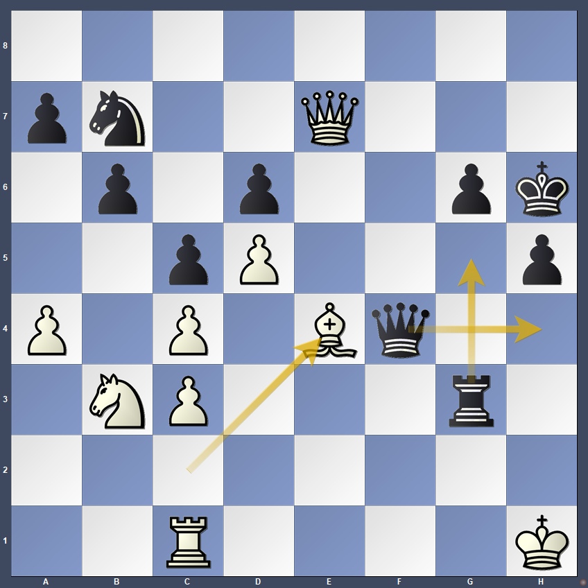 Black’s attack is overwhelming, but accuracy is essential due to the material deficit. Vaishali found the subtle and powerful 46…Rg5!, a quiet rook retreat that sets up the decisive threat of …Qh4 mate. Following 47.Bg2 Qh4, it became clear that 48.Kg1 would fail to 48…Rxg2!, winning the queen on e7. A crisp and elegant finish.