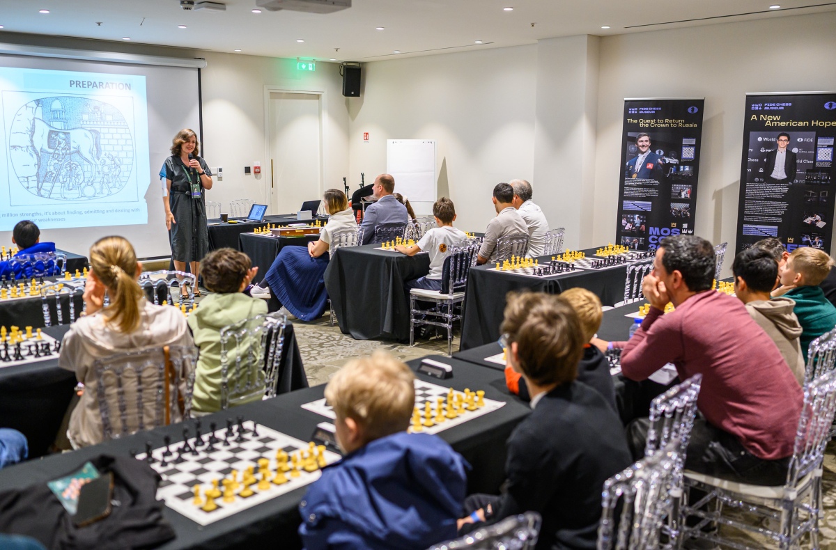 The fan zone was also in full swing. Dana Reizniece delivered a talk titled “How to win at chess? Life lessons learned from chess”, while Sagar Shah hosted a workshop for children. Finally, Dr. Yevgeny Levanzov gave a lecture on “Chess and Maths”, rounding off a busy and engaging day around the playing hall.