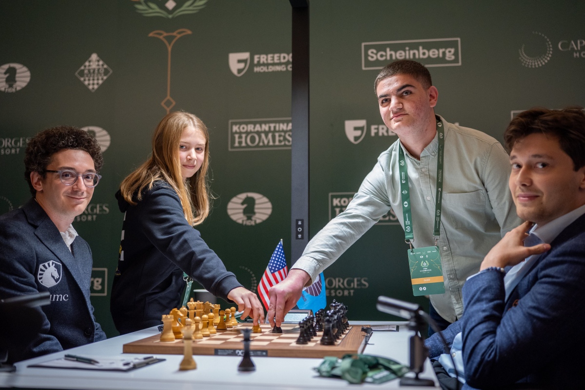 Two ceremonial opening moves took place today. Demetris Skourides, Chief Scientist of the Republic of Cyprus, made the first move for Wei Yi in his game against Sindarov. Meanwhile, the game between Caruana and Esipenko featured young talents at the board: 12-year-old WCM Aida Paunescu, the current Women’s Champion of Cyprus and the youngest national chess champion, played the opening move for Caruana, while 18-year-old FM Rafail Antoniou, the reigning Champion of Cyprus, opened for Esipenko.