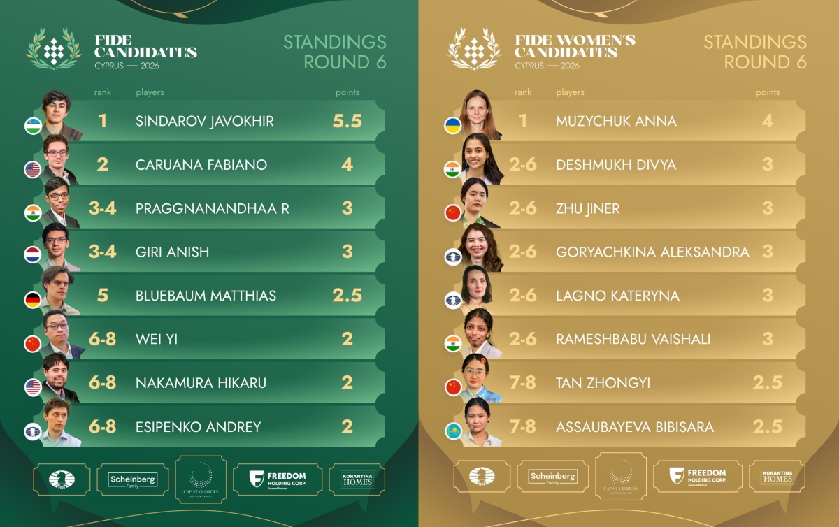 Javokhir Sindarov has now scored an incredible five wins from six games, defeating Wei Yi to further extend his lead in the FIDE Candidates Tournament 2026. Meanwhile, Fabiano Caruana could only manage a draw and now trails by one and a half points.