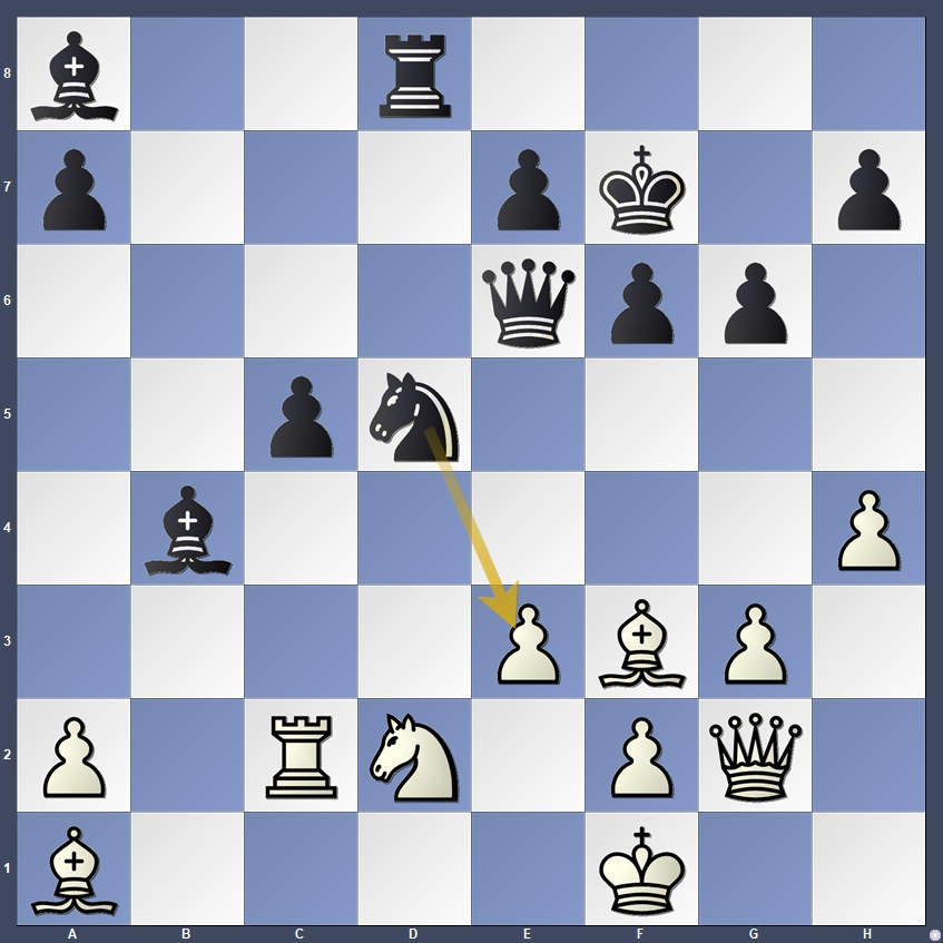 21…Nxe3! 22.fxe3 Rxd2 22…Rxd2 23.Rxd2 Bxf3 24.Qxf3 Bxd2 would win a third pawn (either e3 or a2) with a completely winning endgame, so Keymer resigned. 0–1