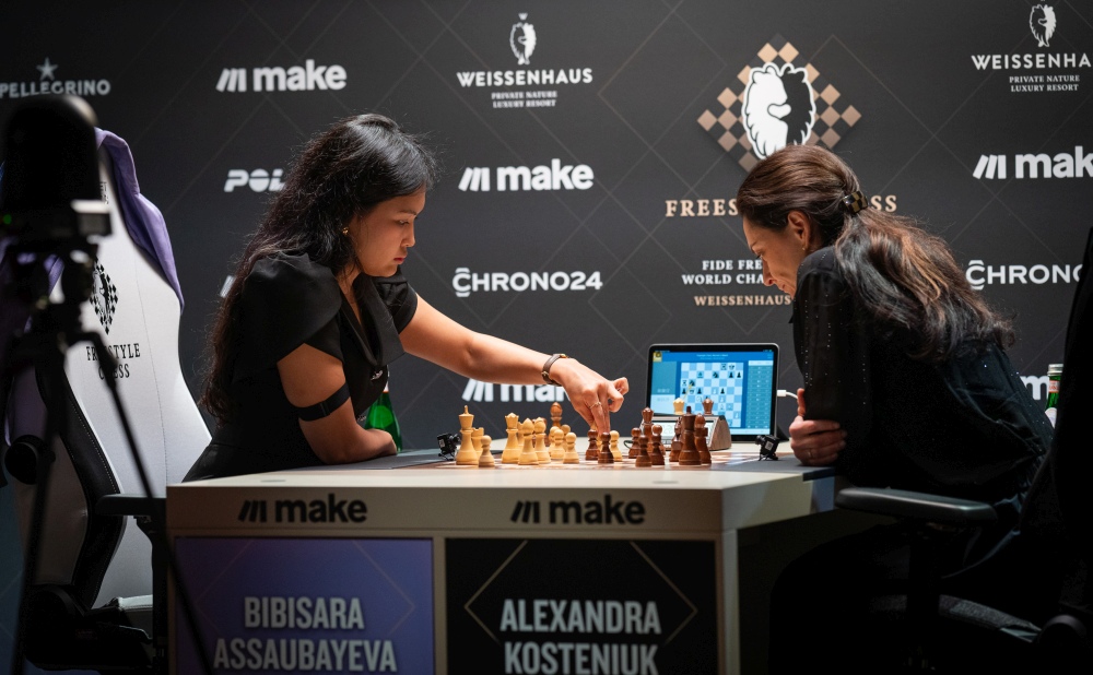 The women’s exhibition match between Bibisara Assaubayeva and Alexandra Kosteniuk is level at 1–1 after two games of their best-of-four encounter. The championship concludes on Sunday with the final and placement matches.