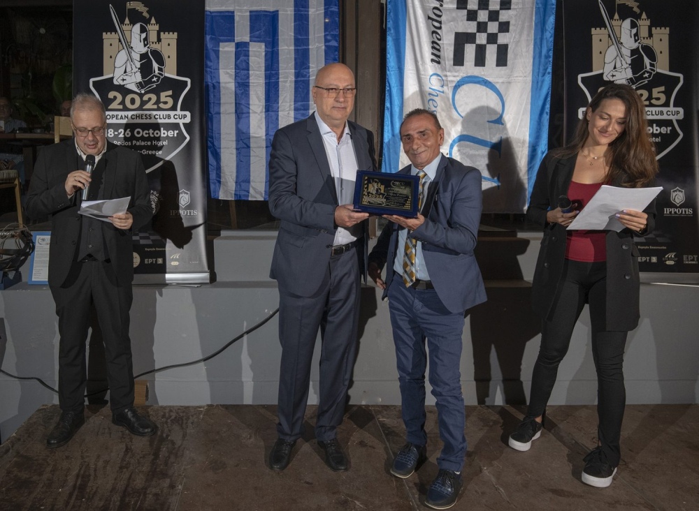 The ceremony took place yesterday evening at the Amalfi Club and Restaurant in Rhodes. Attendees included ECU President Zurab Azmaiparashvili, ECU Vice Presidents Jean Michel Rapaire and Alojzije Jankovic, ECU Tournament Director Petr Pisk, ECU Secretary General Theodoros Tsorbatzoglou, Vice Governor of the South Aegean Region Zisimos Vasileios Delaportas, Vice Mayors of Rhodes Mixalis Pligos and Georgios Patas, Vice President of the Ippotis Chess Club Kambouropoulos, and other distinguished guests who took part in the awards ceremony.