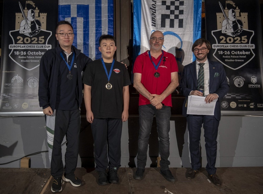 Heading into the final round, SuperChess held a perfect score and a one-match-point lead over Hungary’s Tuxera Aquaprofit Nagykanizsai Sakk Klub. The two teams clashed for the top spot, with SuperChess needing only a draw to secure the trophy. They emerged victorious with a 3.5-2.5 match score, finishing the tournament with a perfect 14 match points.