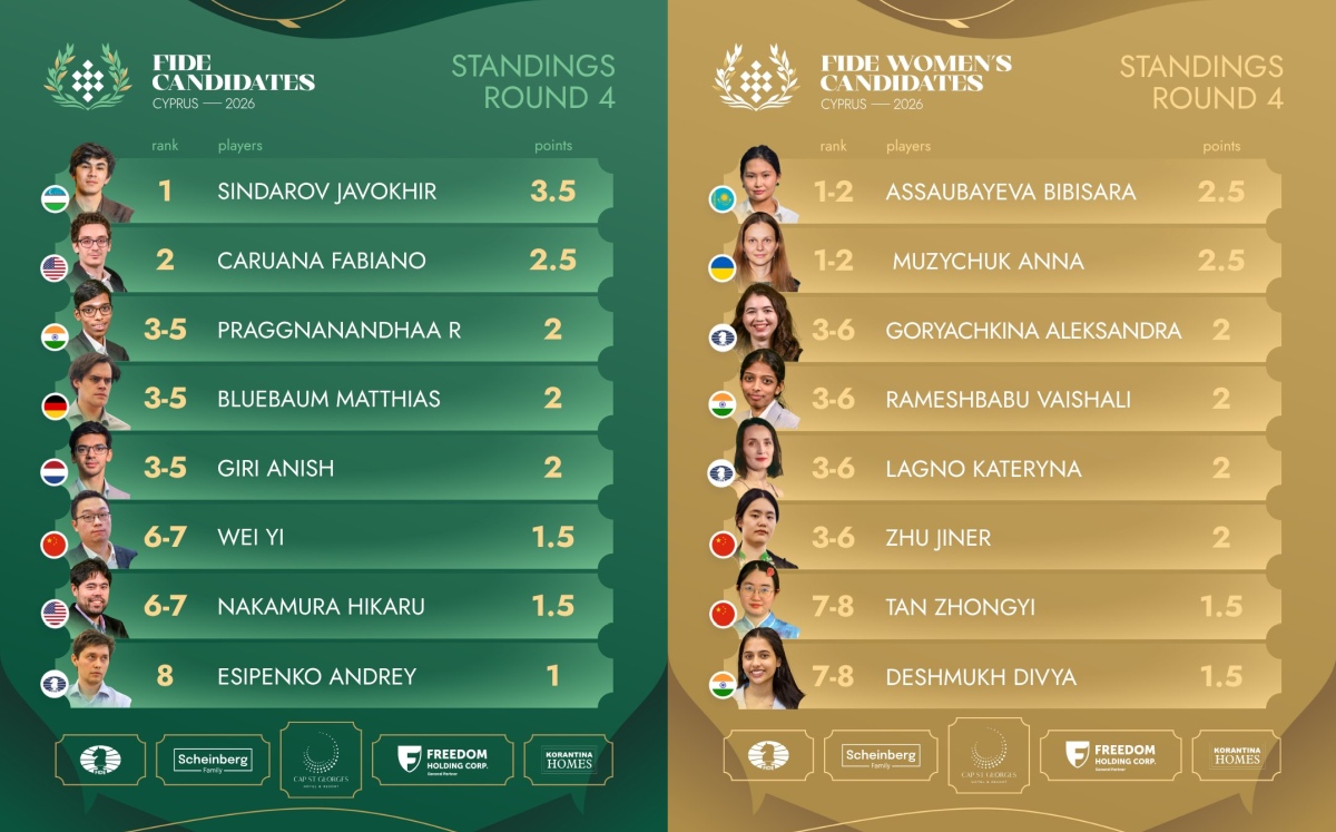 In the FIDE Women’s Candidates, Zhu Jiner and Anna Muzychuk regained momentum with important victories, with Muzychuk now sharing the tournament lead with Bibisara Assaubayeva.