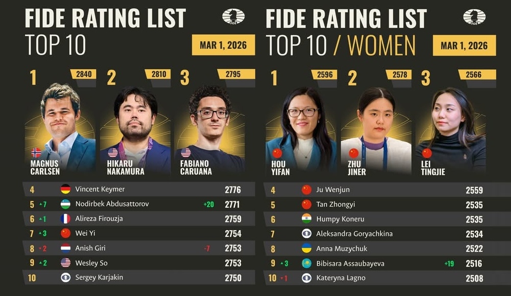 Both the Open and Women’s top 10 saw significant changes. Nodirbek Abdusattorov returned to the Open top 5 after a 19-month absence, thanks to his victory in the Tata Steel Masters. Bibisara Assaubayeva re-entered the Women’s top 10 following her strong performance in the Tata Steel Challengers.