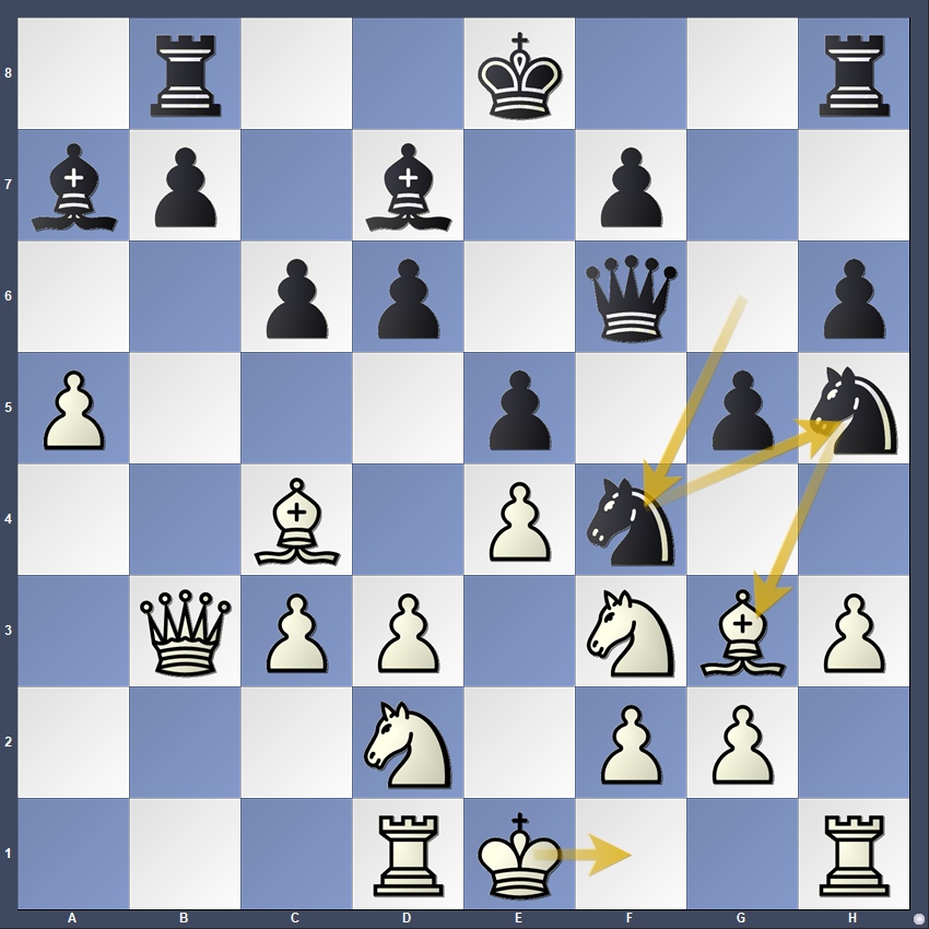 Playing with the black pieces, Woodward had already seized the initiative. With his last move, 19…Ngf4, he attacked the pawn on g2. White needed to eliminate the knight immediately, but after just three minutes of reflection, Gusain blundered with 20.Kf1?, allowing 20…Nxg3+ 21.fxg3 Nh5!, creating the decisive threat of 22…Nxg3, which would win material.