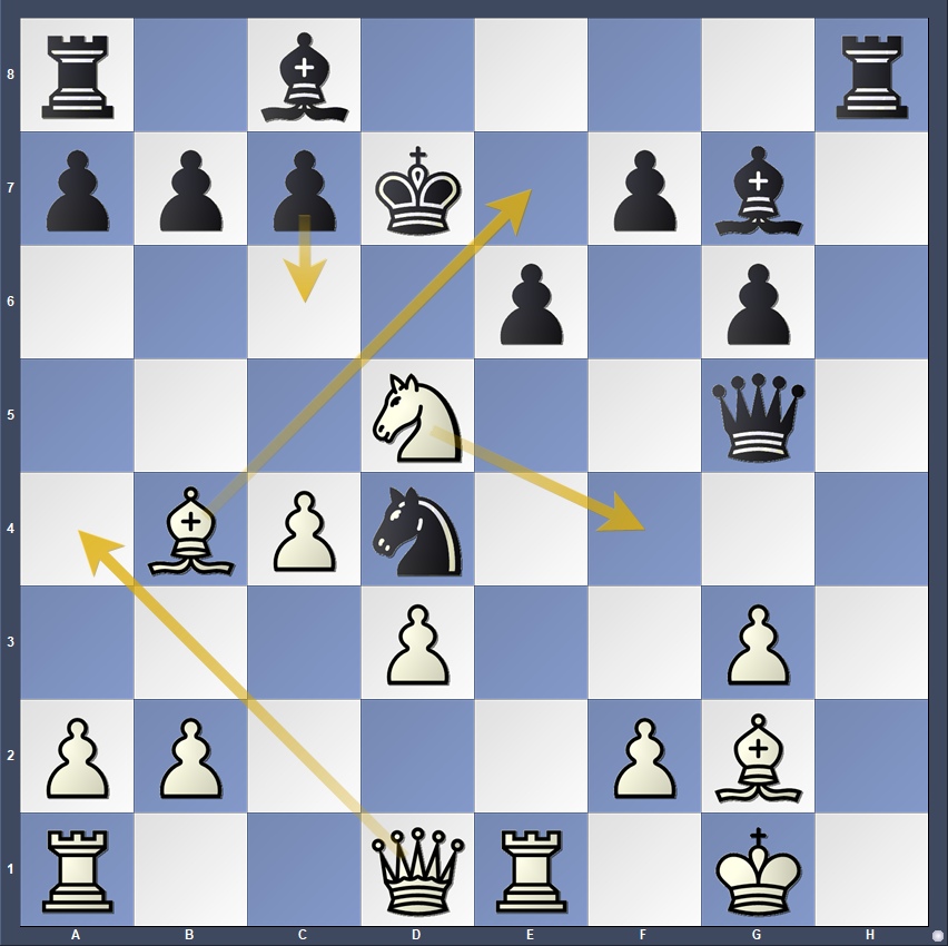 The Serbian’s king on d7 was in serious trouble in this chaotic position, clearly favorable for White. Schnaider spent nearly fifteen minutes here, weighing his attacking options, before deciding on 17.Nf4, and ended up just slightly better. However, he missed a golden opportunity to press for the full point. Instead the move played, he could have launched a powerful assault with 17.Qa4+!