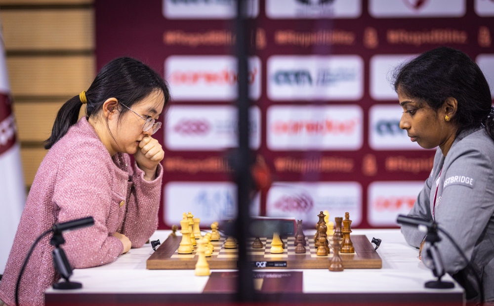 Meanwhile, the reigning Women’s World Champion in classical chess, Ju Wenjun, ended the day on 3 points as well. In Round 1, she was held to a surprising draw by Azerbaijan’s Govhar Beydullayeva, rated over 300 points lower. Playing White, Beydullayeva seized the initiative early and maintained an edge for most of the game. Ju escaped only by sacrificing material to reach a technical draw – a bare king versus a pawn and a bishop and of the “wrong color”. After winning in Round 2, Ju suffered another minor setback in Round 3, missing a clear chance to win material as Black against Umida Omonova, settling for another draw.