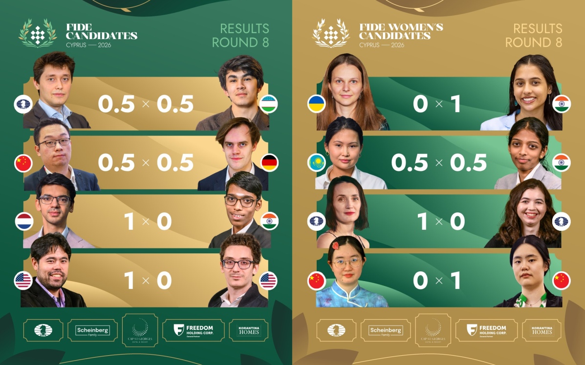 In the FIDE Women’s Candidates, Anna Muzychuk lost to Divya Deshmukh, leaving five players tied for the lead and the tournament wide open. Three decisive outcomes in Round 8 highlight the remarkable balance and competitiveness of the women’s field.
