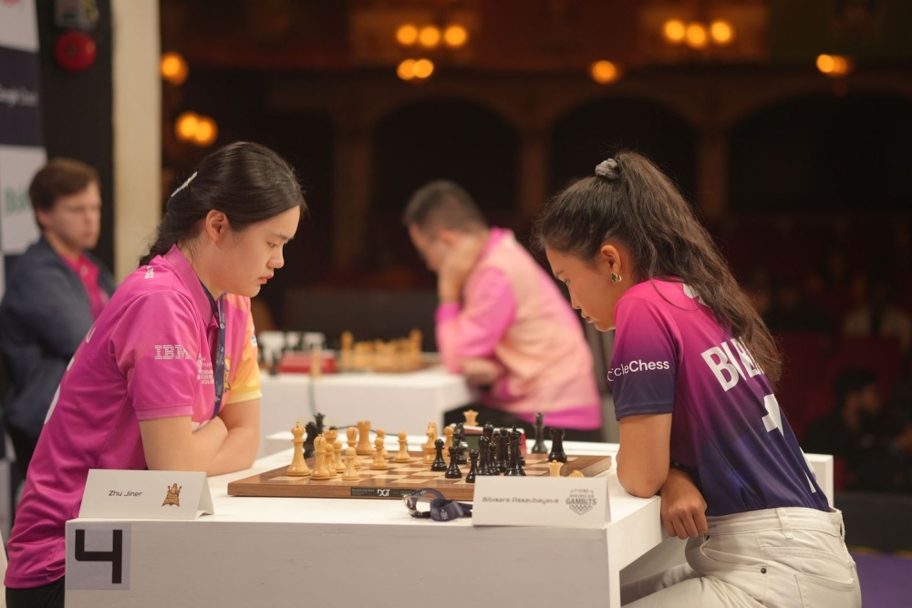The women’s game between Bibisara Assaubayeva (Gambits) and Zhu Jiner followed a different pattern. Assaubayeva obtained the better position and pushed for more. At the critical juncture she made a serious mistake that completely turned the tables. White emerged with a decisive advantage but then it was Zhu’s turn to falter. After she hastily grabbed the rook the game liquidated into an opposite-coloured bishops ending, in which White had no winning chanced despite an extra pawn. The game soon ended in a draw.