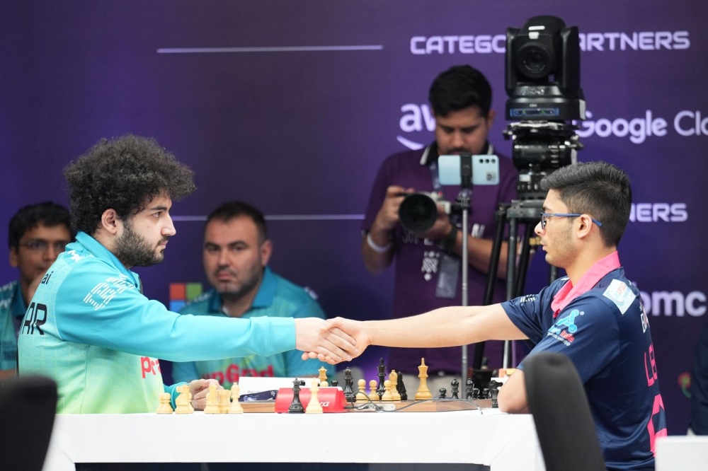 The first result, however, was peaceful: on the prodigy board, Daniel Dardha and Raunak Sadhwani repeated moves and agreed a draw. After their dramatic earlier games in the league, this time neither side took full risk and the match began with one Game Point each.