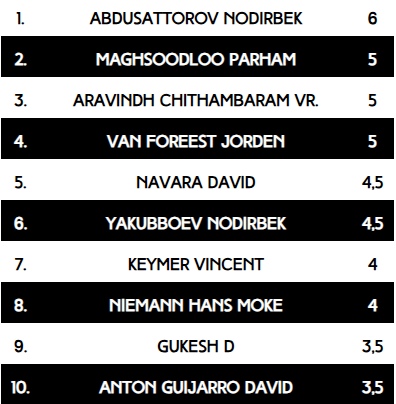 Going into the final round a half-point ahead of Van Foreest, Abdusattorov drew with Hans Niemann and secured the title with 6/9, as his main rival suffered second consecutive defeat, this time at the hands of Parham Maghsoodloo. As a result, Maghsoodloo, Aravindh and Van Foreest tied for second place on 5/9, with the first two joining Abdusattrov on the podium due to superior tiebreaks.