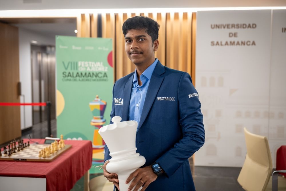With this win Pranav practically secured the prestigious title in Salamanca. The World Junior Champion finished strong with two wins on the final day, scoring 9.5/10 and achieving an impressive performance rating of 2949.