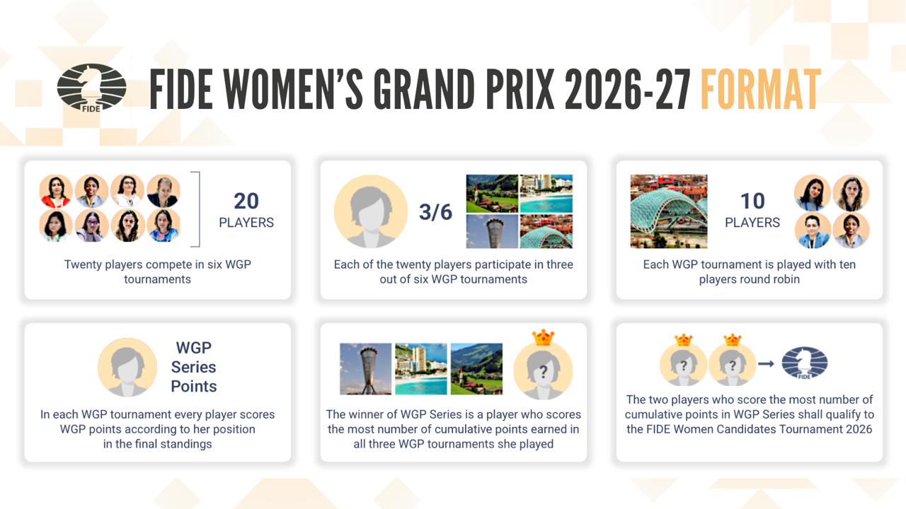 The new FIDE Women’s Grand Prix season will see 20 top women players, each playing in three out of six tournaments, each featuring a 10-player round robin, fighting for the top two places leading to the 2028 Women’s Candidates Tournament.
