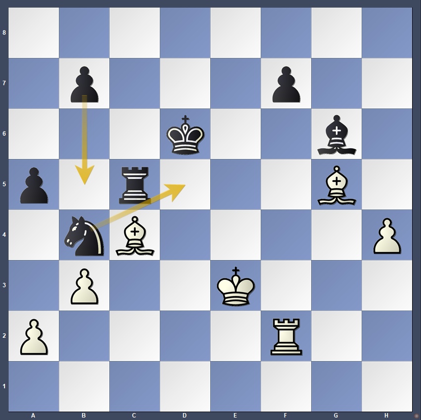 Despite being under pressure in a difficult endgame, the Frenchman still had drawing chances, but in time trouble he blundered with 47…Nd5+? (the correct move was 47…b5, with approximate equality). After 48.Kd4! b5 49.Bh6!, Black was suddenly lost due to the unstoppable threat of Bf8, which wins material.