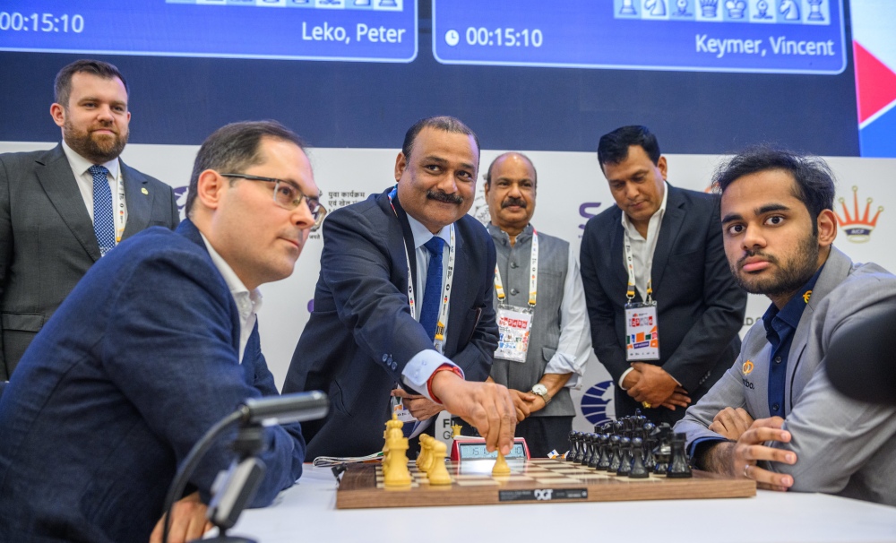 The round was opened by IA Dharmendra Kumar, President of the South Asian Chess Council and Chair of the 2025 FIDE World Cup Appeals Committee. He played 1.e4 for Peter Leko on board two.
