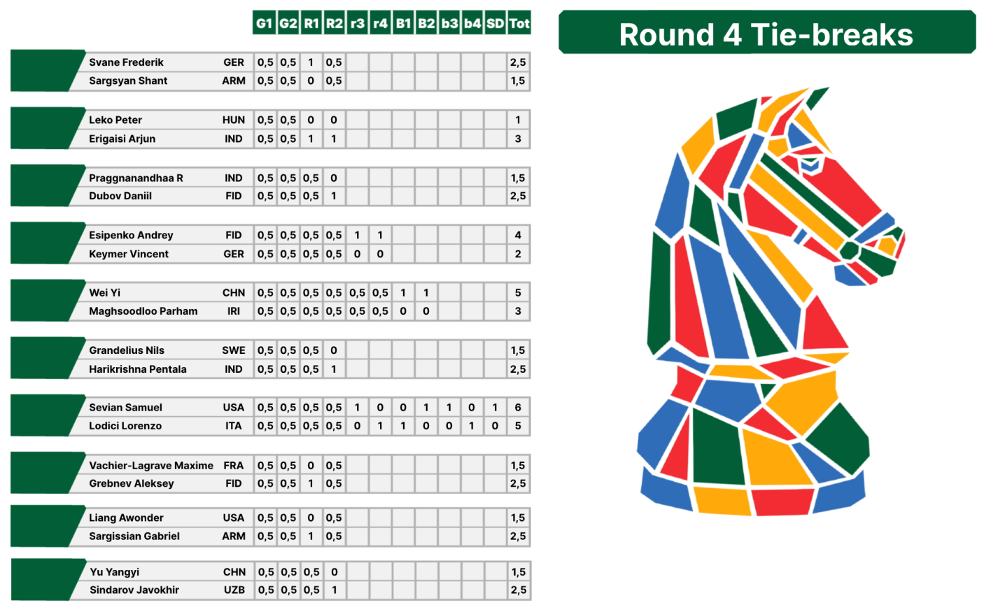 The three remaining matches, all of which ended in draws in both of their initial rapid games, advanced to the next stage of faster time controls: 10-minute games with a 10-second increment.