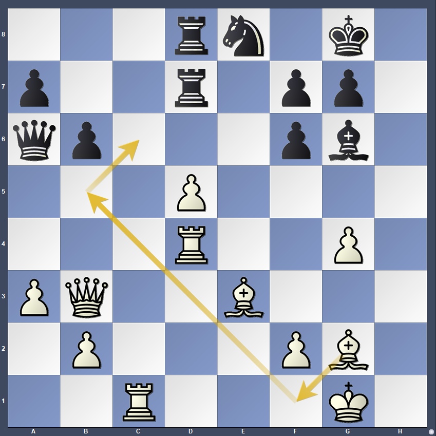 Material is equal, but Lagno holds a clear positional advantage thanks to the bishop pair and the potential of a passed d-pawn. What followed was a beautiful and highly instructive manoeuvre: