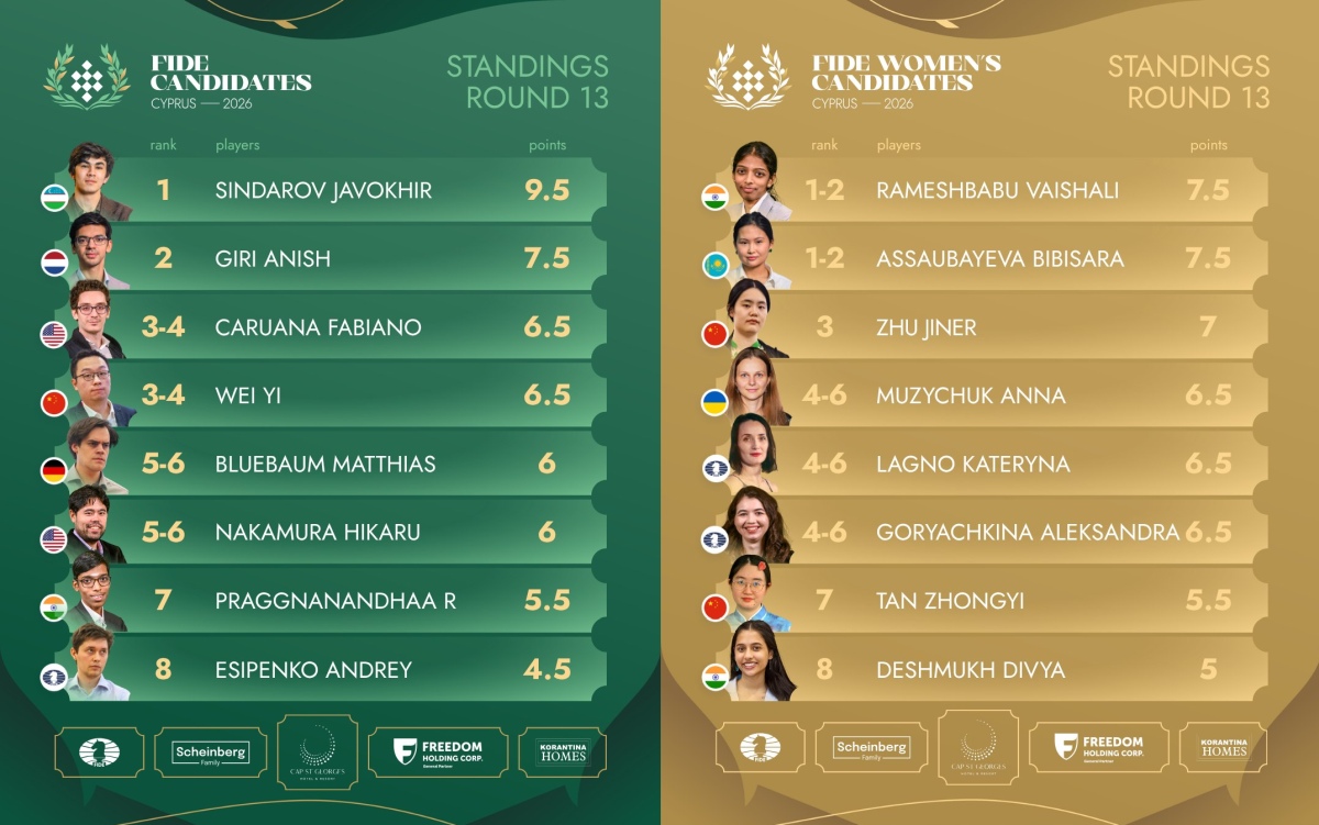 In the key game of the round, Javokhir Sindarov held Anish Giri to a draw, securing first place and claiming victory in the FIDE Candidates Tournament.
