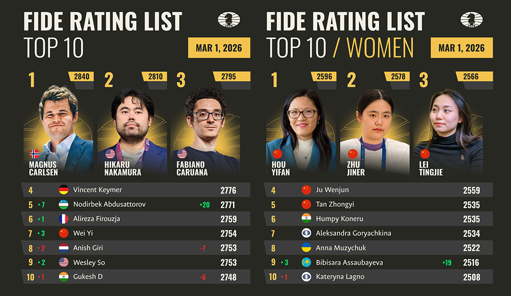 FIDE October 2025 Rating List: Zhu Jiner climbs to #2, Anish Giri returns to top 10 Open October 1, 2025