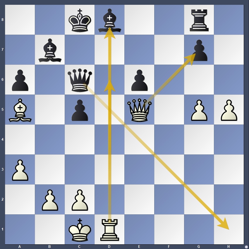 In the position after 31…Qe4-Qc6, GM Joshua Sheng (White) was a piece down against IM Valeriy Grinev, but engines evaluated it as equal due to White’s activity. The commentators pointed out the stunning tactical opportunity: 32.Qxg7! The queen cannot be captured as 32…Rxg7 fails to 33.Rxd8#. The only defense for Black in this case would have been 32…Qe8, still holding equality. Instead, Sheng played 32.Rd6, and after 32…Qh1+, the game was drawn soon by three-fold repetition.