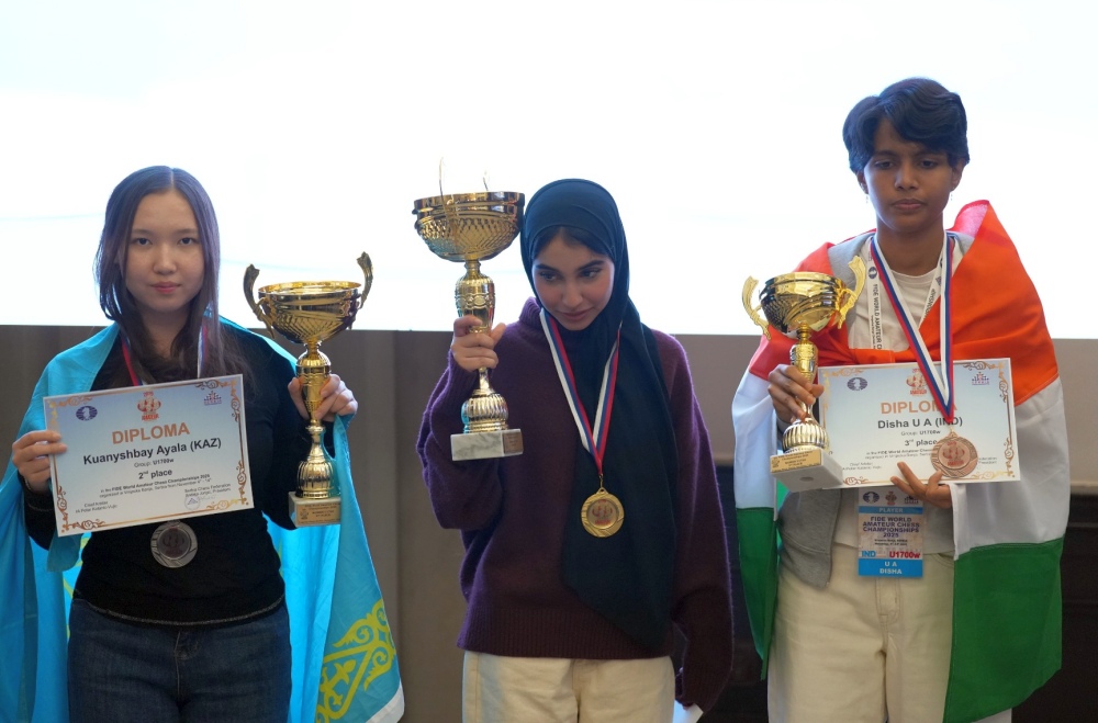 The best female chess players in the U1700 event are Mouza Nasser Alshamsi, (UAE) scoring 7/9 followed by Ayala Kuanyshbay (Kazakhstan) and Disha U A from India.
