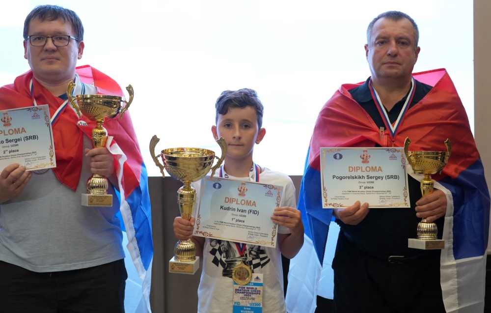 The most tightly contested tournament was the U2300 Open section, which ended in a three-way tie for first. Ivan Kudrin (FIDE), Sergei Krivenko, and Sergei Pogorelskikh (both Serbia) all scored 7/9, with Kudrin claiming gold, Krivenko silver, and Pogorelskikh bronze based on tiebreak scores.